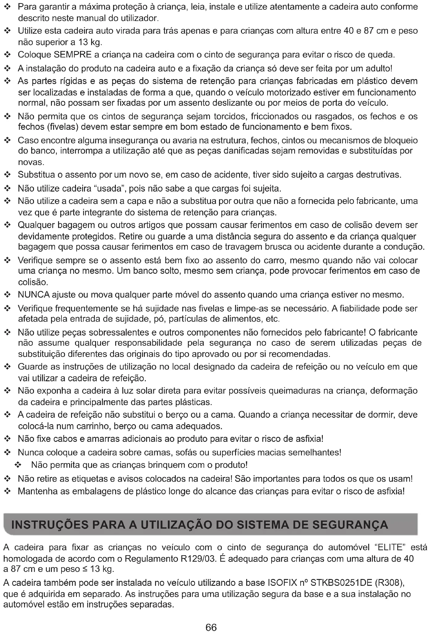 Instale neste assento apenas se equipado com cinto de segurança de 3 pontos. ATENÇÃO! AVISOS! AVISO! NUNCA DEIXE A CRIANÇA SEM VIGILÂNCIA! AVISO! NÃO UTILIZE OUTROS PONTOS DE CONTACTO PARA ALÉM DOS DESCRITOS NAS INSTRUÇÕES E MARCADOS NA CADEIRA DO AUTOMÓVEL! AVISO! NUNCA COLOQUE A CADEIRA AUTOMÓVEL NUM BANCO DE PASSAGEIROS EQUIPADO COM AIR BAG ATIVO! ISTO PODE RESULTAR EM MORTE OU LESÕES GRAVES! AVISO! OS CINTOS DE SEGURANÇA DO VEÍCULO QUE FIXAM A CADEIRA AO BANCO DO AUTOMÓVEL DEVEM SER APERTOS E FIXADOS! AVISO! OS CINTOS DE SEGURANÇA QUE RETÊM A CRIANÇA DEVEM ESTAR BEM APERTOS E FIXADOS, AJUSTADOS DE ACORDO COM O CORPO E AS DIMENSÕES DA CRIANÇA PARA QUE OS COBREM BEM. AVISO! O CINTO LIP DEVE ESTAR LOCALIZADO BAIXO E CADA BARREIRA DE PROTEÇÃO DEVE SER INSTALADA CORRETAMENTE PARA QUE A PELVE DA CRIANÇA SEJA APOIADA DEVIDAMENTE SEM PRESSÃO. AVISO! NÃO FAÇA ALTERAÇÕES, ADIÇÕES OU MODIFICAÇÕES À CADEIRA AUTO SEM A APROVAÇÃO DA AUTORIDADE NOTIFICADA! É PERIGOSO NÃO SEGUIR EXATAMENTE AS INSTRUÇÕES DE UTILIZAÇÃO FORNECIDAS PELO FABRICANTE! AVISO! MANTENHA FORA DO FOGO! 65 Para garantir a máxima proteção à criança, leia, instale e utilize atentamente a cadeira auto conforme descrito neste manual do utilizador. Utilize esta cadeira auto virada para trás apenas e para crianças com altura entre 40 e 87 cm e peso não superior a 13 kg. Coloque SEMPRE a criança na cadeira com o cinto de segurança para evitar o risco de queda. A instalação do produto na cadeira auto e a xação da criança só deve ser feita por um adulto! As partes rígidas e as peças do sistema de retenção para crianças fabricadas em plástico devem ser localizadas e instaladas de forma a que, quando o veículo motorizado estiver em funcionamento normal, não possam ser xadas por um assento deslizante ou por meios de porta do veículo. Não permita que os cintos de segurança sejam torcidos, friccionados ou rasgados, os fechos e os fechos (velas) devem estar sempre em bom estado de funcionamento e bem xos. Caso encontre alguma insegurança ou avaria na estrutura, fechos, cintos ou mecanismos de bloqueio do banco, interrompa a utilização até que as peças danicadas sejam removidas e substituídas por novas. Substitua o assento por um novo se, em caso de acidente, tiver sido sujeito a cargas destrutivas. Não utilize cadeira “usada”, pois não sabe a que cargas foi sujeita. Não utilize a cadeira sem a capa e não a substitua por outra que não a fornecida pelo fabricante, uma vez que é parte integrante do sistema de retenção para crianças. Qualquer bagagem ou outros artigos que possam causar ferimentos em caso de colisão devem ser devidamente protegidos. Retire ou guarde a uma distância segura do assento e da criança qualquer bagagem que possa causar ferimentos em caso de travagem brusca ou acidente durante a condução. Verique sempre se o assento está bem xo ao assento do carro, mesmo quando não vai colocar uma criança no mesmo. Um banco solto, mesmo sem criança, pode provocar ferimentos em caso de colisão. NUNCA ajuste ou mova qualquer parte móvel do assento quando uma criança estiver no mesmo. Verique frequentemente se há sujidade nas velas e limpe-as se necessário. A abilidade pode ser afetada pela entrada de sujidade, pó, partículas de alimentos, etc. Não utilize peças sobressalentes e outros componentes não fornecidos pelo fabricante! O fabricante não assume qualquer responsabilidade pela segurança no caso de serem utilizadas peças de substituição diferentes das originais do tipo aprovado ou por si recomendadas. Guarde as instruções de utilização no local designado da cadeira de refeição ou no veículo em que vai utilizar a cadeira de refeição. Não exponha a cadeira à luz solar direta para evitar possíveis queimaduras na criança, deformação da cadeira e principalmente das partes plásticas. A cadeira de refeição não substitui o berço ou a cama. Quando a criança necessitar de dormir, deve colocá-la num carrinho, berço ou cama adequados. Não xe cabos e amarras adicionais ao produto para evitar o risco de asxia! Nunca coloque a cadeira sobre camas, sofás ou superfícies macias semelhantes! Não permita que as crianças brinquem com o produto! Não retire as etiquetas e avisos colocados na cadeira! São importantes para todos os que os usam! Mantenha as embalagens de plástico longe do alcance das crianças para evitar o risco de asxia! INSTRUÇÕES PARA A UTILIZAÇÃO DO SISTEMA DE SEGURANÇA A cadeira para fixar as crianças no veículo com o cinto de segurança do automóvel “ELITE” está homologada de acordo com o Regulamento R129/03. É adequado para crianças com uma altura de 40 a 87 cm e um peso ≤ 13 kg. A cadeira também pode ser instalada no veículo utilizando a base ISOFIX nº STKBS0251DE (R308), que é adquirida em separado. As instruções para uma utilização segura da base e a sua instalação no automóvel estão em instruções separadas. 66AVISO! A BASE DE MONTAGEM DA CADEIRA DUO SMART (R308) NÃO FAZ PARTE DESTE KIT E DEVE SER ADQUIRIDA EM SEPARADO! IMPORTANTE! Siga exatamente as instruções e a sequência de instalação e utilização do produto contidas no texto e nas ilustrações anexas ao manual. Verifique a segurança da fixação após realizar cada operação! VERIFIQUE SEMPRE A SEGURANÇA DA FIXAÇÃO DO CINTO! Após cada instalação, certifique-se de que os cintos de segurança do automóvel não estão torcidos e na posição correta.