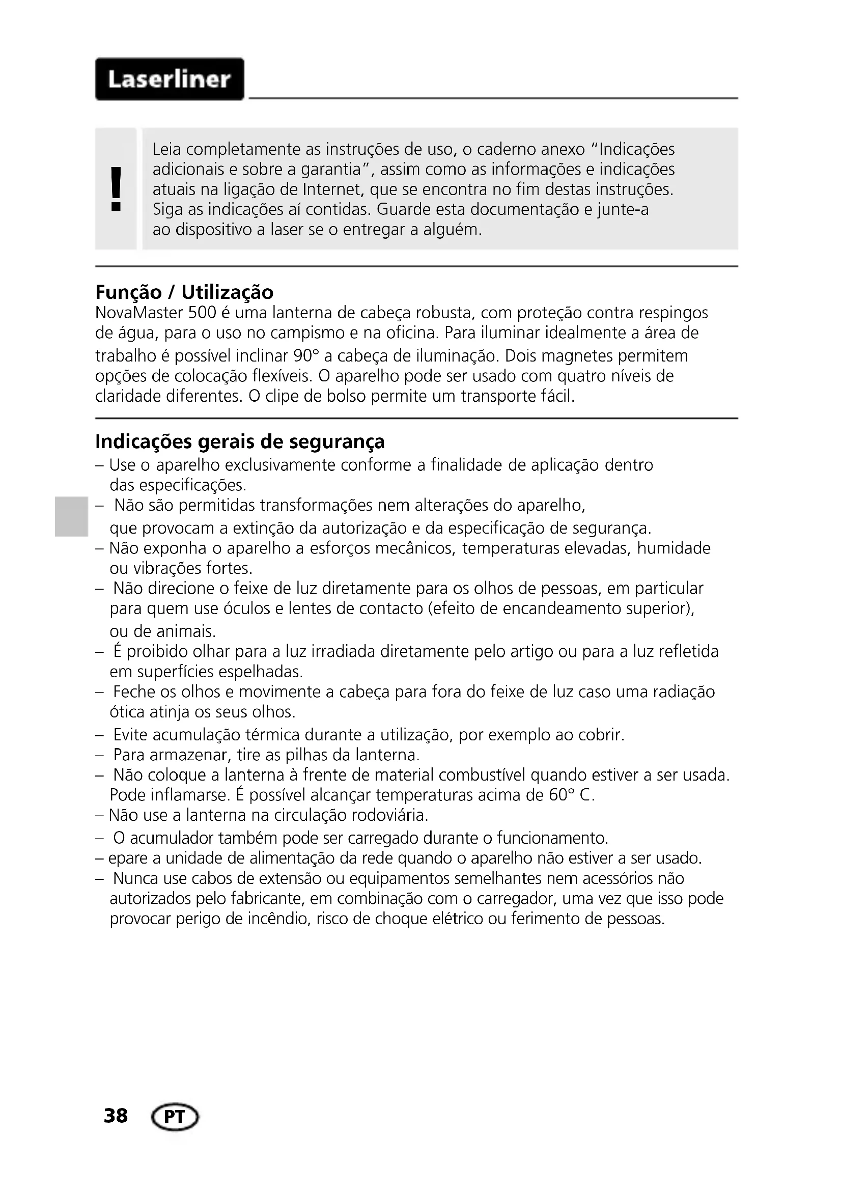 Indicações gerais de segurança – Use o aparelho exclusivamente conforme a finalidade de aplicação dentro das especificações. – Não são permitidas transformações nem alterações do aparelho, que provocam a extinção da autorização e da especificação de segurança. – Não exponha o aparelho a esforços mecânicos, temperaturas elevadas, humidade ou vibrações fortes. – Não direcione o feixe de luz diretamente para os olhos de pessoas, em particular para quem use óculos e lentes de contacto (efeito de encandeamento superior), ou de animais. – É proibido olhar para a luz irradiada diretamente pelo artigo ou para a luz reetida em superfícies espelhadas. – Feche os olhos e movimente a cabeça para fora do feixe de luz caso uma radiação ótica atinja os seus olhos. – Evite acumulação térmica durante a utilização, por exemplo ao cobrir. – Para armazenar, tire as pilhas da lanterna. – Não coloque a lanterna à frente de material combustível quando estiver a ser usada. Pode inamarse. É possível alcançar temperaturas acima de 60° C. – Não use a lanterna na circulação rodoviária. – O acumulador também pode ser carregado durante o funcionamento. – epare a unidade de alimentação da rede quando o aparelho não estiver a ser usado. – Nunca use cabos de extensão ou equipamentos semelhantes nem acessórios não autorizados pelo fabricante, em combinação com o carregador, uma vez que isso pode provocar perigo de incêndio, risco de choque elétrico ou ferimento de pessoas. Função / Utilização NovaMaster 500 é uma lanterna de cabeça robusta, com proteção contra respingos de água, para o uso no campismo e na ocina. Para iluminar idealmente a área de trabalho é possível inclinar 90° a cabeça de iluminação. Dois magnetes permitem opções de colocação exíveis. O aparelho pode ser usado com quatro níveis de claridade diferentes. O clipe de bolso permite um transporte fácil. Leia completamente as instruções de uso, o caderno anexo “Indicações adicionais e sobre a garantia”, assim como as informações e indicações atuais na ligação de Internet, que se encontra no fim destas instruções. Siga as indicações aí contidas. Guarde esta documentação e junte-a ao dispositivo a laser se o entregar a alguém. !NovaMaster 500