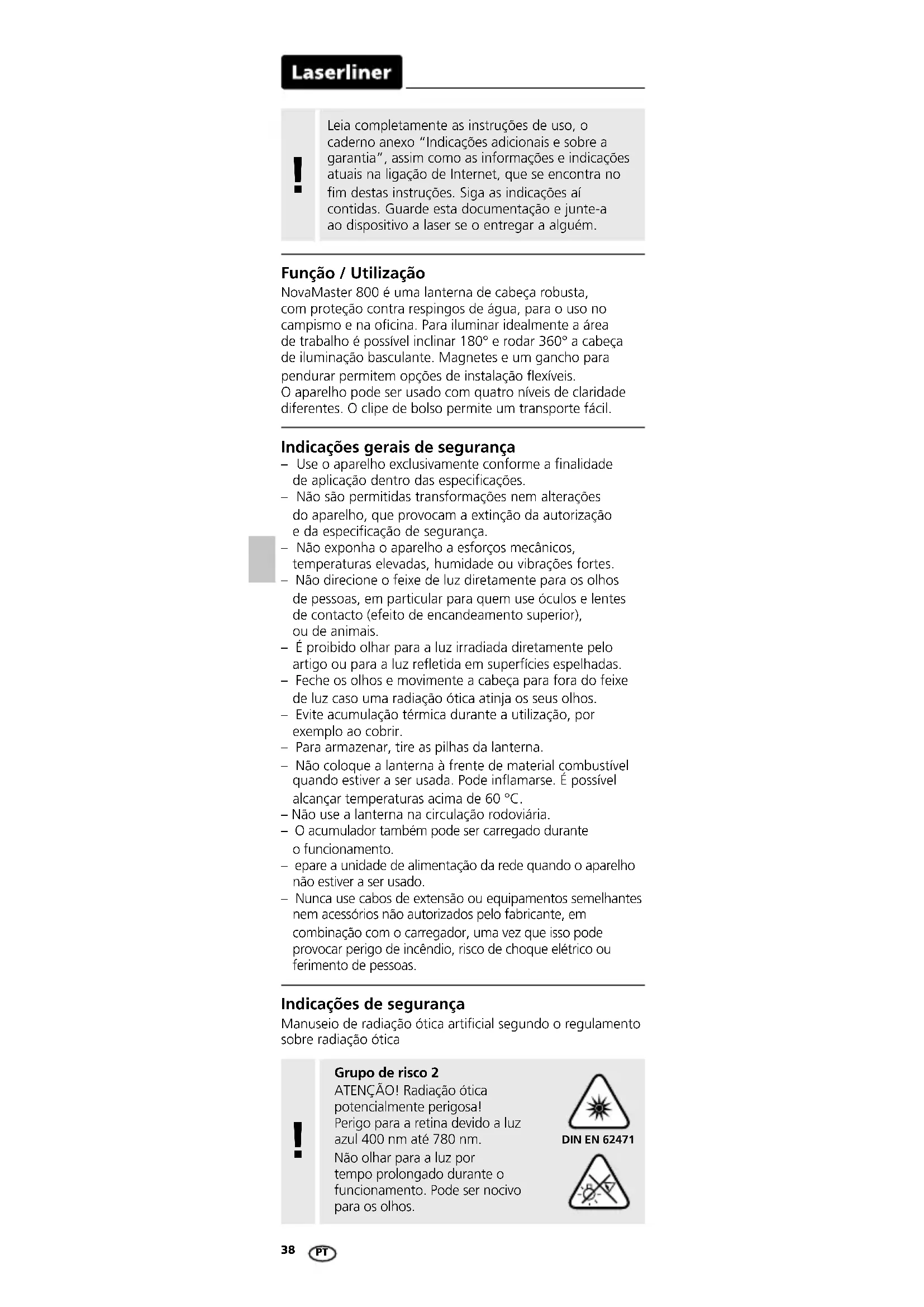 Indicações de segurança Manuseio de radiação ótica articial segundo o regulamento sobre radiação ótica Indicações gerais de segurança – Use o aparelho exclusivamente conforme a finalidade de aplicação dentro das especificações. – Não são permitidas transformações nem alterações do aparelho, que provocam a extinção da autorização e da especificação de segurança. – Não exponha o aparelho a esforços mecânicos, temperaturas elevadas, humidade ou vibrações fortes. – Não direcione o feixe de luz diretamente para os olhos de pessoas, em particular para quem use óculos e lentes de contacto (efeito de encandeamento superior), ou de animais. – É proibido olhar para a luz irradiada diretamente pelo artigo ou para a luz reetida em superfícies espelhadas. – Feche os olhos e movimente a cabeça para fora do feixe de luz caso uma radiação ótica atinja os seus olhos. – Evite acumulação térmica durante a utilização, por exemplo ao cobrir. – Para armazenar, tire as pilhas da lanterna. – Não coloque a lanterna à frente de material combustível quando estiver a ser usada. Pode inamarse. É possível alcançar temperaturas acima de 60 °C. – Não use a lanterna na circulação rodoviária. – O acumulador também pode ser carregado durante o funcionamento. – epare a unidade de alimentação da rede quando o aparelho não estiver a ser usado. – Nunca use cabos de extensão ou equipamentos semelhantes nem acessórios não autorizados pelo fabricante, em combinação com o carregador, uma vez que isso pode provocar perigo de incêndio, risco de choque elétrico ou ferimento de pessoas. Função / Utilização NovaMaster 800 é uma lanterna de cabeça robusta, com proteção contra respingos de água, para o uso no campismo e na ocina. Para iluminar idealmente a área de trabalho é possível inclinar 180° e rodar 360° a cabeça de iluminação basculante. Magnetes e um gancho para pendurar permitem opções de instalação exíveis. O aparelho pode ser usado com quatro níveis de claridade diferentes. O clipe de bolso permite um transporte fácil. Leia completamente as instruções de uso, o caderno anexo “Indicações adicionais e sobre a garantia”, assim como as informações e indicações atuais na ligação de Internet, que se encontra no fim destas instruções. Siga as indicações aí contidas. Guarde esta documentação e junte-a ao dispositivo a laser se o entregar a alguém.