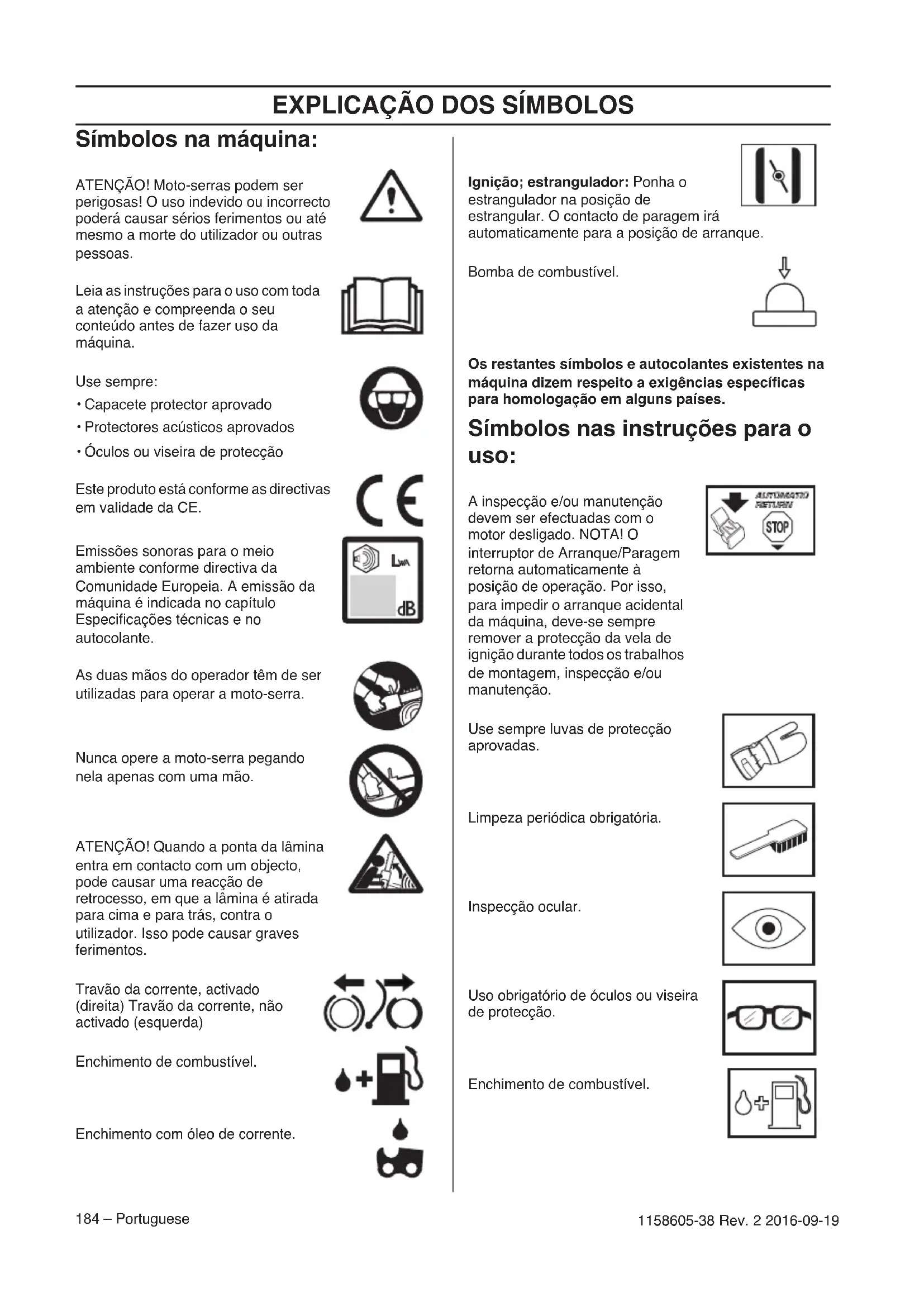 Os restantes símbolos e autocolantes existentes na máquina dizem respeito a exigências específicas para homologação em alguns países. Símbolos nas instruções para o uso: A inspecção e/ou manutenção devem ser efectuadas com o motor desligado. NOTA! O interruptor de Arranque/Paragem retorna automaticamente à posição de operação. Por isso, para impedir o arranque acidental da máquina, deve-se sempre remover a protecção da vela de ignição durante todos os trabalhos de montagem, inspecção e/ou manutenção. Use sempre luvas de protecção aprovadas. Limpeza periódica obrigatória. Inspecção ocular. Uso obrigatório de óculos ou viseira de protecção. Enchimento de combustível.EXPLICAÇÃO DOS SÍMBOLOS Portuguese – 185 1158605-38 Rev. 2 2016-09-19 Enchimento de óleo e ajustamento do caudal do óleo. O travão da corrente deve estar activado no arranque da moto-serra. ATENÇÃO! Quando a ponta da lâmina entra em contacto com um objecto, pode causar uma reacção de retrocesso, em que a lâmina é atirada para cima e para trás, contra o utilizador. Isso pode causar graves ferimentos.ÍNDICE 186 – Portuguese 1158605-38 Rev. 2 2016-09-19 Índice