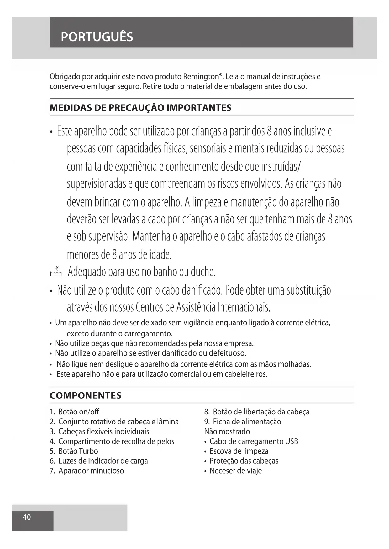 AE40 Obrigado por adquirir este novo produto Remington®. Leia o manual de instruções e conserve-o em lugar seguro. Retire todo o material de embalagem antes do uso.