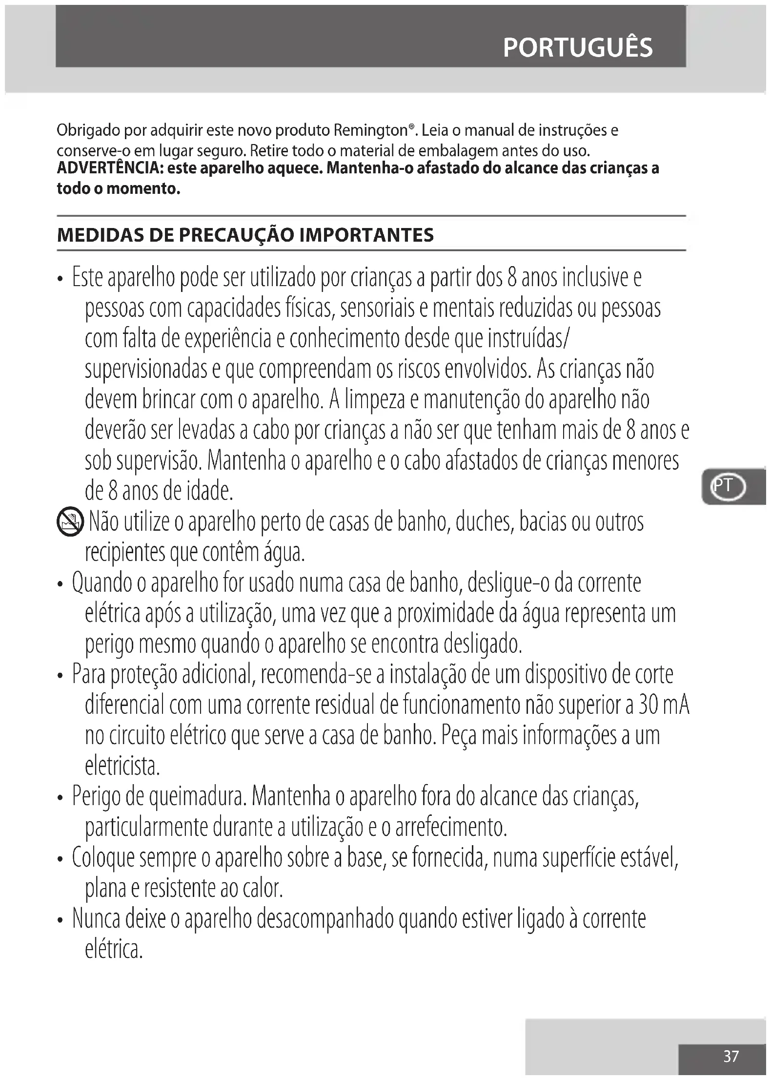 - Este aparelho pode ser utilizado por crianças a partir dos 8 anos inclusive e pessoas com capacidades físicas, sensoriais e mentais reduzidas ou pessoas com falta de experiência e conhecimento desde que instruídas/ supervisionadas e que compreendam os riscos envolvidos. As crianças não devem brincar com o aparelho. A limpeza e manutenção do aparelho não deverão ser levadas a cabo por crianças a não ser que tenham mais de 8 anos e sob supervisão. Mantenha o aparelho e o cabo afastados de crianças menores de 8 anos de idade. L Não utilize o aparelho perto de casas de banho, duches, bacias ou outros recipientes que contêm água.