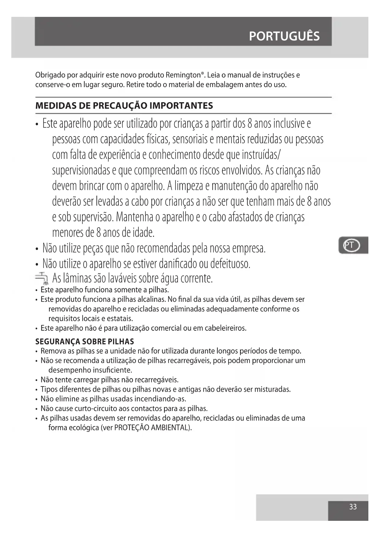 - Este aparelho funciona somente a pilhas.• Este produto funciona a pilhas alcalinas. No final da sua vida útil, as pilhas devem ser removidas do aparelho e recicladas ou eliminadas adequadamente conforme os requisitos locais e estatais.• Este aparelho não é para utilização comercial ou em cabeleireiros.SEGURANÇA SOBRE PILHAS• Remova as pilhas se a unidade não for utilizada durante longos períodos de tempo.• Não se recomenda a utilização de pilhas recarregáveis, pois podem proporcionar um desempenho insuficiente.• Não tente carregar pilhas não recarregáveis.• Tipos diferentes de pilhas ou pilhas novas e antigas não deverão ser misturadas.• Não elimine as pilhas usadas incendiando-as.• Não cause curto-circuito aos contactos para as pilhas.• As pilhas usadas devem ser removidas do aparelho, recicladas ou eliminadas de uma forma ecológica (ver PROTEÇÃO AMBIENTAL). PORTUGUÊS