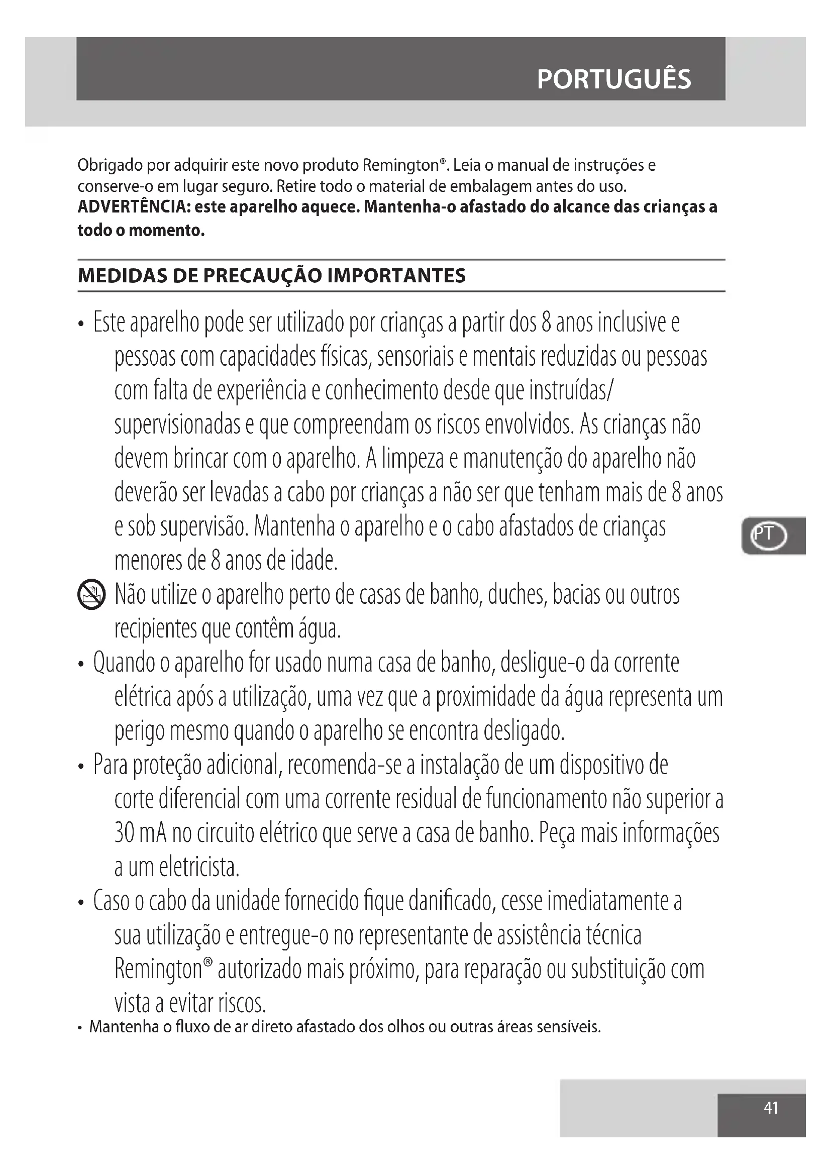 - Caso o cabo da unidade fornecido fique danificado, cesse imediatamente a sua utilização e entregue-o no representante de assistência técnica Remington® autorizado mais próximo, para reparação ou substituição com vista a evitar riscos.