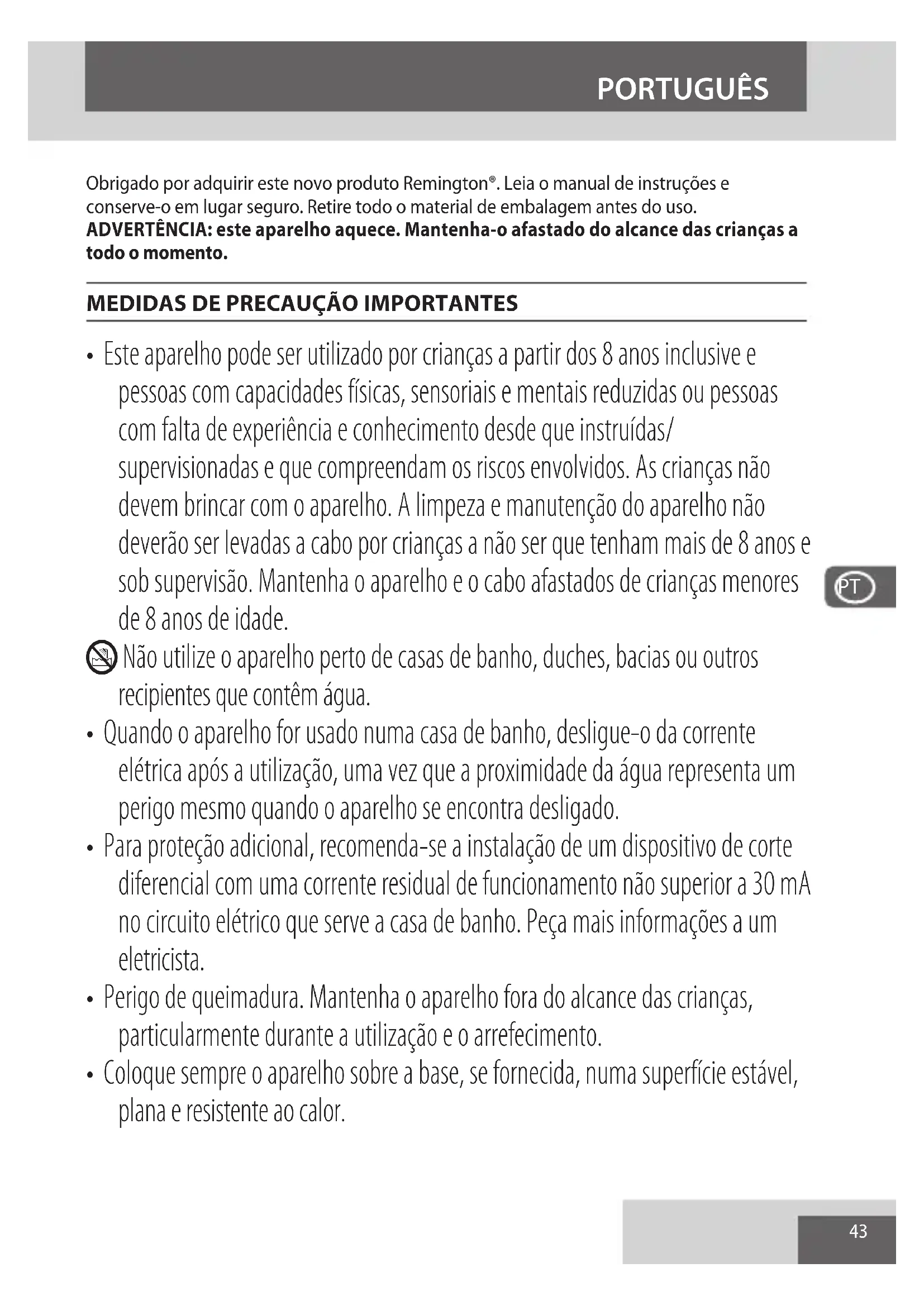 - Este aparelho pode ser utilizado por crianças a partir dos 8 anos inclusive e pessoas com capacidades físicas, sensoriais e mentais reduzidas ou pessoas com falta de experiência e conhecimento desde que instruídas/ supervisionadas e que compreendam os riscos envolvidos. As crianças não devem brincar com o aparelho. A limpeza e manutenção do aparelho não deverão ser levadas a cabo por crianças a não ser que tenham mais de 8 anos e sob supervisão. Mantenha o aparelho e o cabo afastados de crianças menores de 8 anos de idade. L Não utilize o aparelho perto de casas de banho, duches, bacias ou outros recipientes que contêm água.