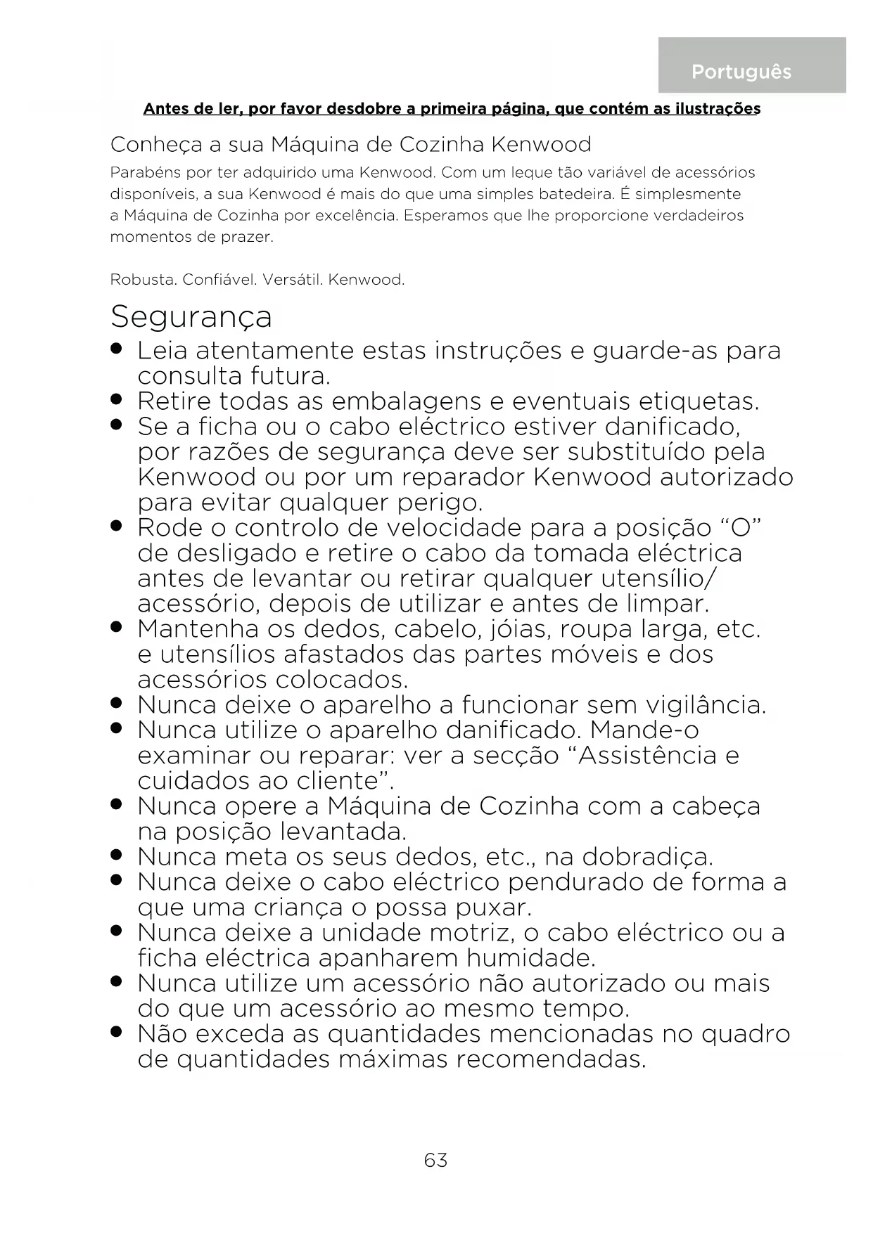 Não exceda as quantidades mencionadas no quadro de quantidades máximas recomendadas. Português Antes de ler, por favor desdobre a primeira página, que contém as ilustrações 63O Quando utilizar um acessório, leia e siga as instruções de segurança, que acompanham o aparelho.