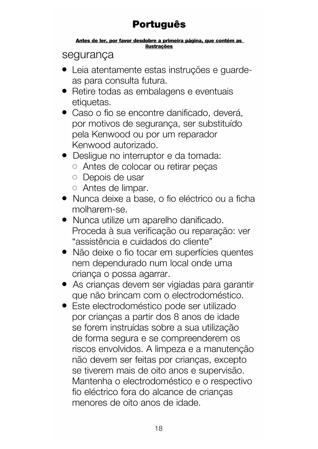 Este electrodoméstico pode ser utilizado por crianças a partir dos 8 anos de idade se forem instruídas sobre a sua utilização de forma segura e se compreenderem os riscos envolvidos. A limpeza e a manutenção não devem ser feitas por crianças, excepto se tiverem mais de oito anos e supervisão. Mantenha o electrodoméstico e o respectivo fio eléctrico fora do alcance de crianças menores de oito anos de idade. Antes de ler, por favor desdobre a primeira página, que contém as ilustrações Português19 20