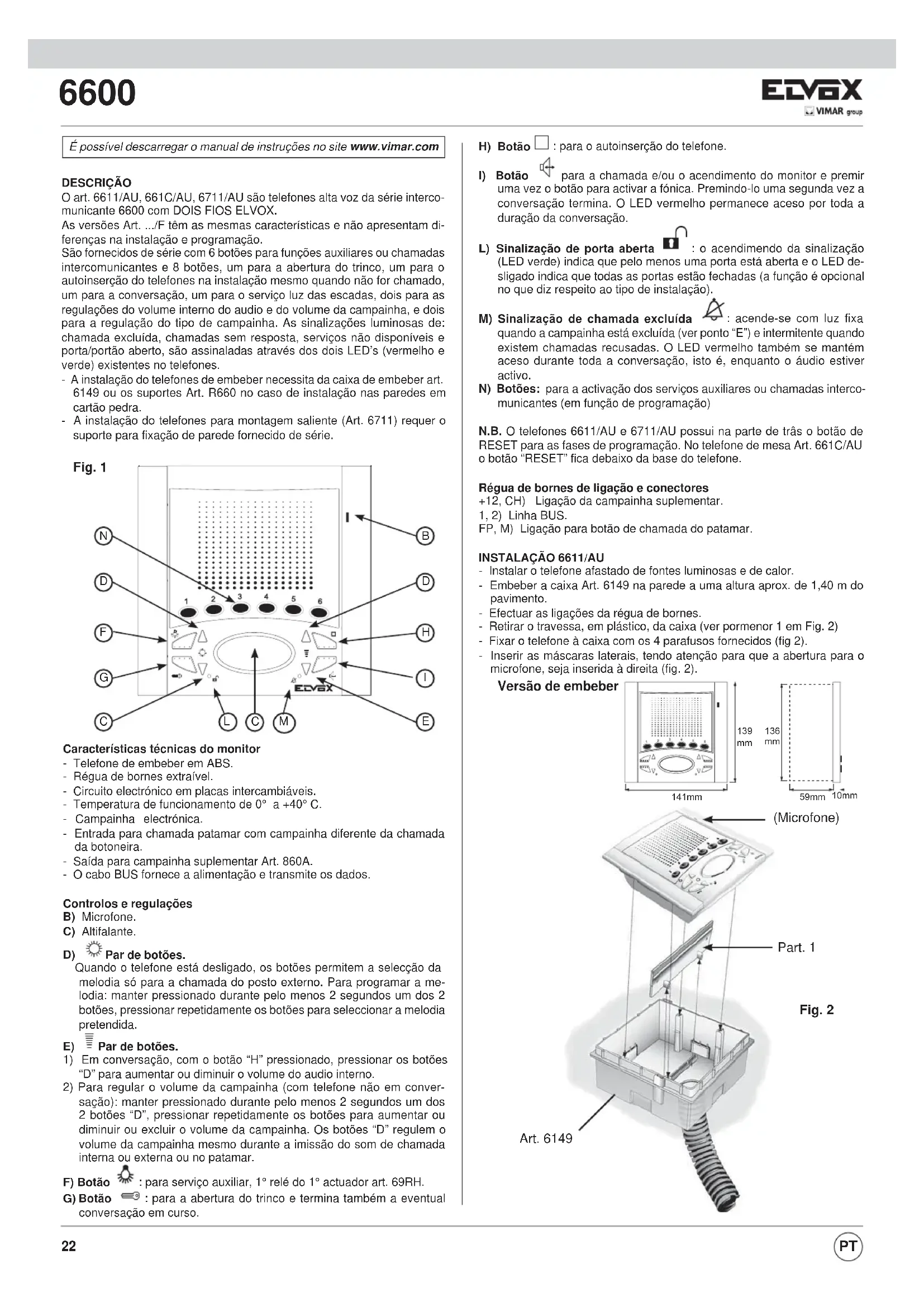 - Instalar o telefone afastado de fontes luminosas e de calor. - Embeber a caixa Art. 6149 na parede a uma altura aprox. de 1,40 m do pavimento. - Efectuar as ligações da régua de bornes. - Retirar o travessa, em plástico, da caixa (ver pormenor 1 em Fig. 2) - Fixar o telefone à caixa com os 4 parafusos fornecidos (fig 2). - Inserir as máscaras laterais, tendo atenção para que a abertura para o microfone, seja inserida à direita (fig. 2). Versão de embeber Fig. 2 (Microfone) Art. 6149 Part. 1 DESCRIÇÃO O art. 6611/AU, 661C/AU, 6711/AU são telefones alta voz da série interco- municante 6600 com DOIS FIOS ELVOX. As versões Art. .../F têm as mesmas características e não apresentam di- ferenças na instalação e programação. São fornecidos de série com 6 botões para funções auxiliares ou chamadas intercomunicantes e 8 botões, um para a abertura do trinco, um para o autoinserção do telefones na instalação mesmo quando não for chamado, um para a conversação, um para o serviço luz das escadas, dois para as regulações do volume interno do audio e do volume da campainha, e dois para a regulação do tipo de campainha. As sinalizações luminosas de: chamada excluída, chamadas sem resposta, serviços não disponíveis e porta/portão aberto, são assinaladas através dos dois LED’s (vermelho e verde) existentes no telefones. - A instalação do telefones de embeber necessita da caixa de embeber art. 6149 ou os suportes Art. R660 no caso de instalação nas paredes em cartão pedra. - A instalação do telefones para montagem saliente (Art. 6711) requer o suporte para fixação de parede fornecido de série. RESET Fig. 1