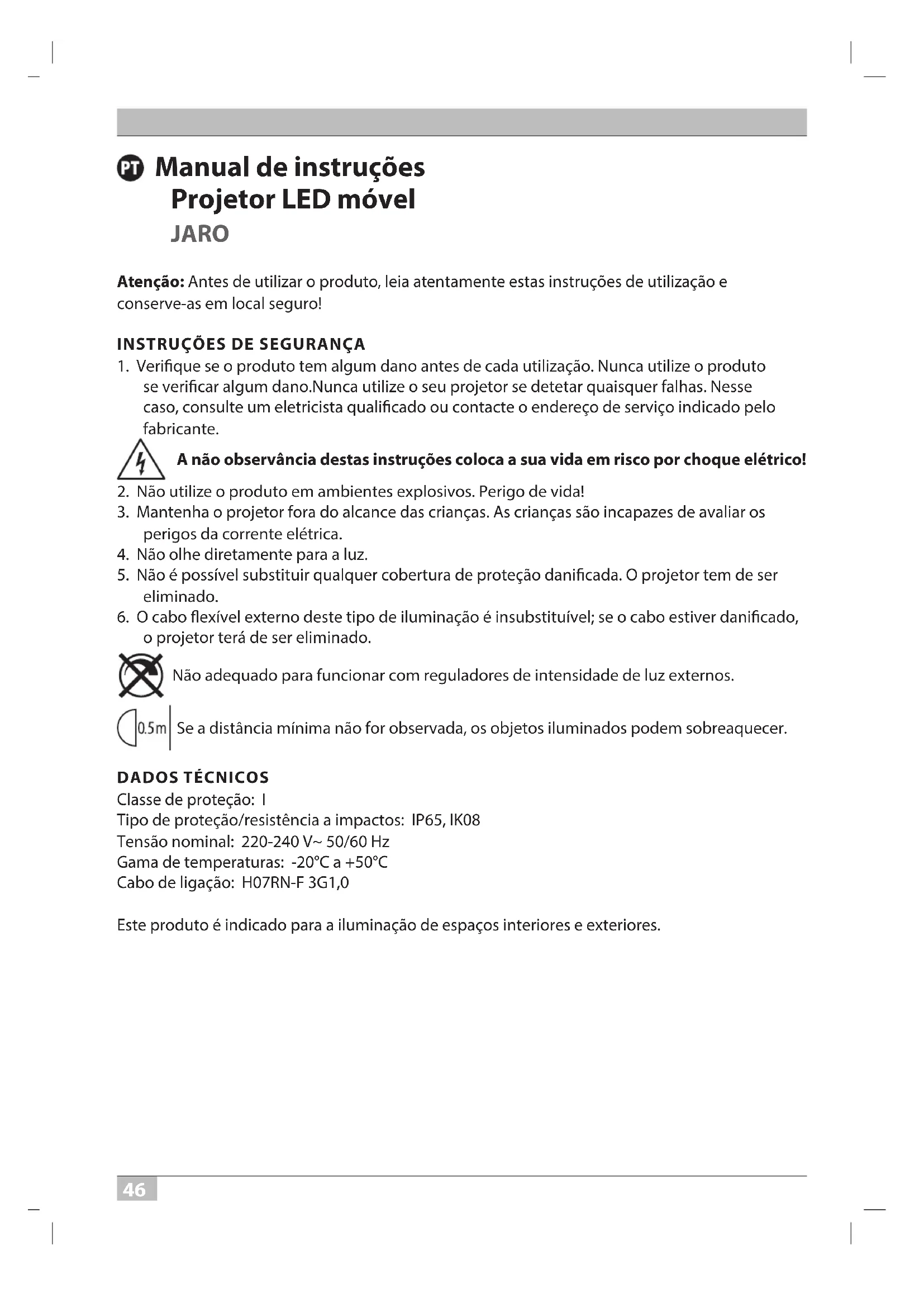 Classe de proteção: I Tipo de proteção/resistência a impactos: IP65, IK08 Tensão nominal: 220-240 V~ 50/60 Hz Gama de temperaturas: -20°C a +50°C Cabo de ligação: H07RN-F 3G1,0 Este produto é indicado para a iluminação de espaços interiores e exteriores. 20P117 Mobiler LED Strahler Jaro 10-50W 0533125 210409.indd 46 09.04.2021 13:15:384747 JARO Manual de instruções