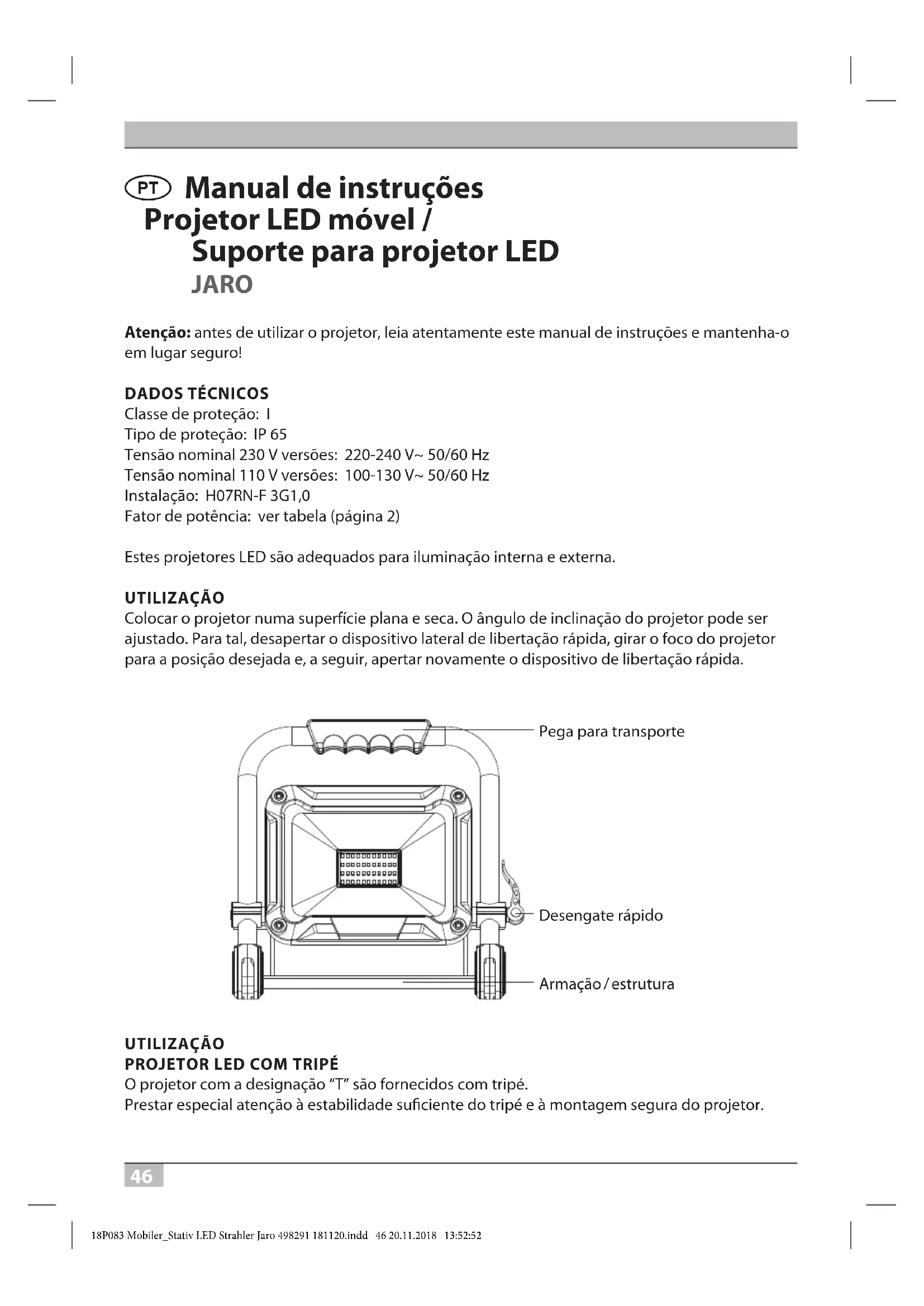 Hugo Brennenstuhl GmbH & Co. KG Seestraße 1 – 3 · D-72074 Tübingen H. Brennenstuhl S.A.S. 4 rue de Bruxelles · F-67170 Bernolsheim lectra-t ag Blegistrasse 13 · CH-6340 Baar www.brennenstuhl.com 18P083 Mobiler_Stativ LED Strahler Jaro 498291 181120.indd 45 20.11.2018 13:52:5246 O Manual de instruções Projetor LED móvel / Suporte para projetor LED JARO Atenção: antes de utilizar o projetor, leia atentamente este manual de instruções e mantenha-o em lugar seguro!