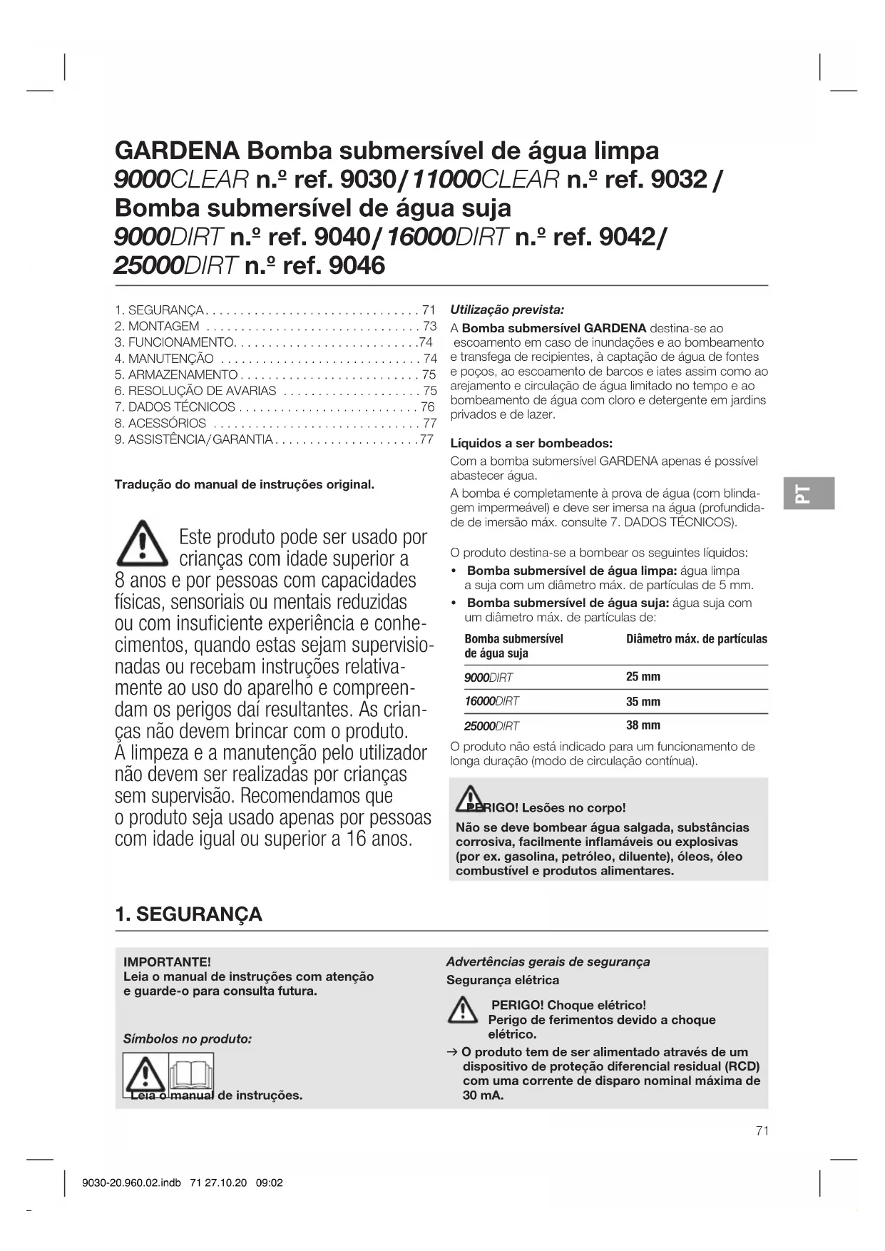 Tradução do manual de instruções original. Este produto pode ser usado por crianças com idade superior a 8anos e por pessoas com capacidades físicas, sensoriais ou mentais reduzidas ou com insuficiente experiência e conhe- cimentos, quando estas sejam supervisio- nadas ou recebam instruções relativa- mente ao uso do aparelho e compreen- dam os perigos daí resultantes. As crian- ças não devem brincar com o produto. Alimpeza e a manutenção pelo utilizador não devem ser realizadas por crianças sem supervisão. Recomendamos que oproduto seja usado apenas por pessoas com idade igual ou superior a 16anos. Utilização prevista: A Bomba submersível GARDENA destina-se ao escoamento em caso de inundações e ao bombeamento e transfega de recipientes, à captação de água de fontes epoços, ao escoamento de barcos e iates assim como ao arejamento e circulação de água limitado no tempo e ao bombeamento de água com cloro e detergente em jardins privados e de lazer. Líquidos a ser bombeados: Com a bomba submersível GARDENA apenas é possível abastecer água. A bomba é completamente à prova de água (com blinda- gem impermeável) e deve ser imersa na água (profundida- de de imersão máx. consulte 7. DADOS TÉCNICOS). O produto destina-se a bombear os seguintes líquidos: