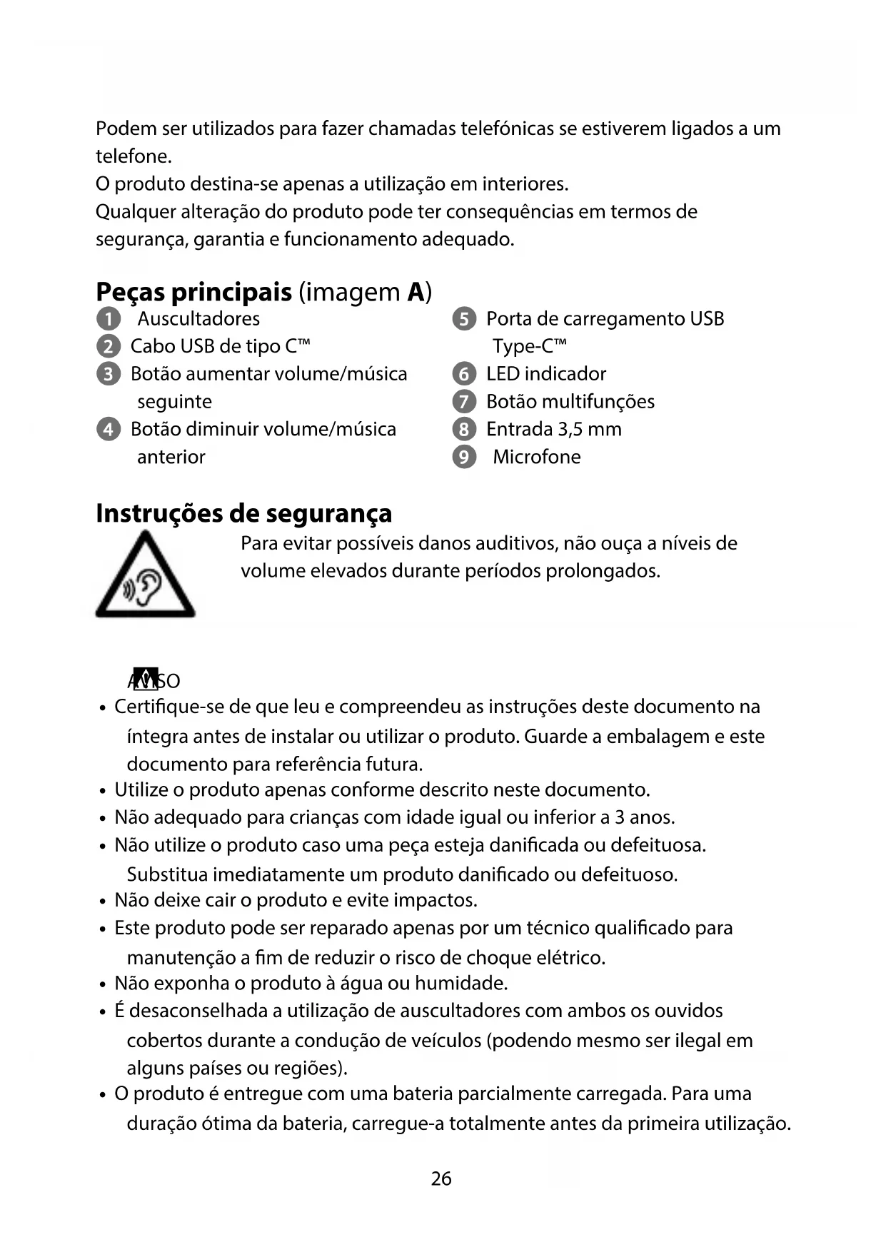 Guia de iniciação rápida Auriculares para crianças HPBT4000BK Para mais informações, consulte a versão alargada do manual on-line: ned.is/hpbt4000bk Utilização prevista Os HPBT4000BK da Nedis são auriculares sem os com limite de volume. Este produto pode ser emparelhado com qualquer dispositivo de áudio/vídeo com Bluetooth®.26 Podem ser utilizados para fazer chamadas telefónicas se estiverem ligados a um telefone. O produto destina-se apenas a utilização em interiores. Qualquer alteração do produto pode ter consequências em termos de segurança, garantia e funcionamento adequado. Peças principais (imagem A) 1 Auscultadores 2 Cabo USB de tipo C™ 3 Botão aumentar volume/música seguinte 4 Botão diminuir volume/música anterior 5 Porta de carregamento USB Type-C™ 6 LED indicador 7 Botão multifunções 8 Entrada 3,5 mm 9 Microfone Instruções de segurança Para evitar possíveis danos auditivos, não ouça a níveis de volume elevados durante períodos prolongados.