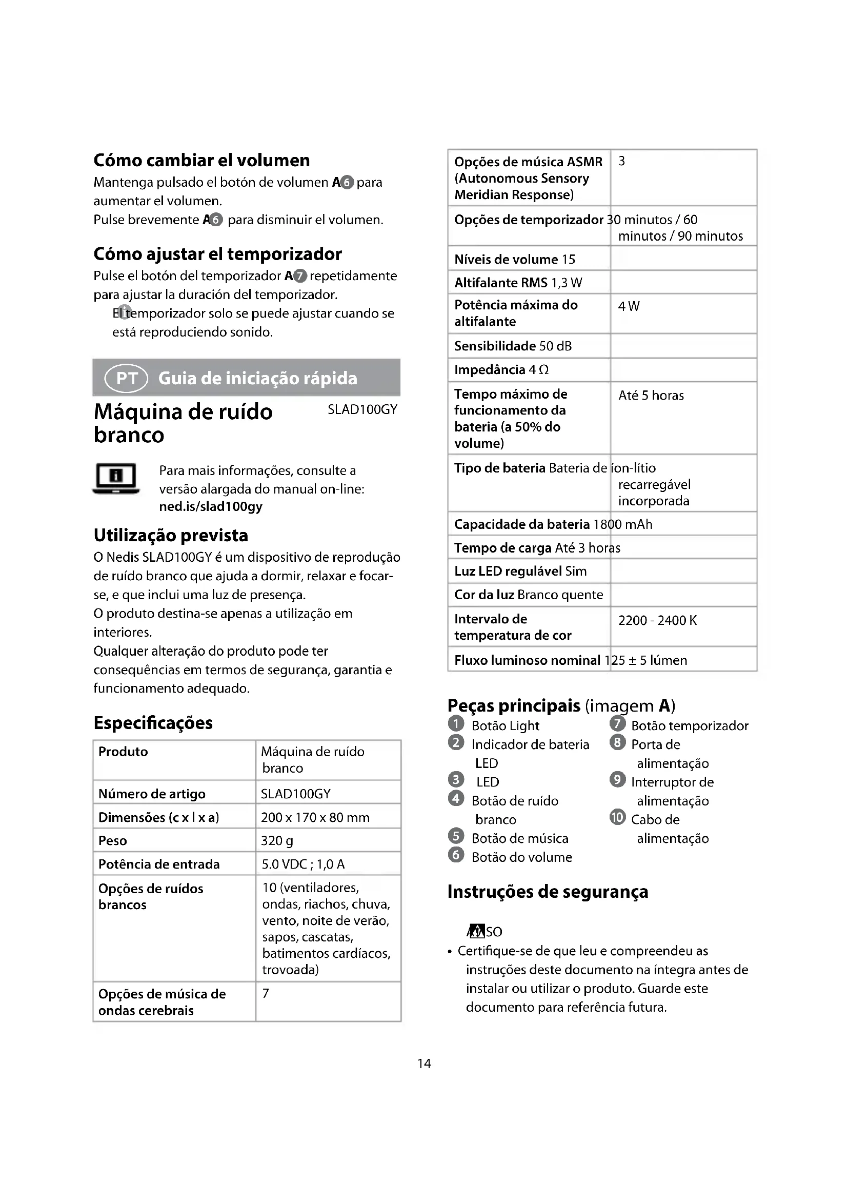 Guia de iniciação rápida Máquina de ruído branco SLAD100GYPara mais informações, consulte a versão alargada do manual on-line: ned.is/slad100gy Utilização prevista O Nedis SLAD100GY é um dispositivo de reprodução de ruído branco que ajuda a dormir, relaxar e focar-se, e que inclui uma luz de presença.O produto destina-se apenas a utilização em interiores.Qualquer alteração do produto pode ter consequências em termos de segurança, garantia e funcionamento adequado. Especicações Produto Máquina de ruído brancoNúmero de artigo SLAD100GYDimensões (c x l x a) 200 x 170 x 80 mmPeso 320 gPotência de entrada 5.0 VDC ; 1,0 AOpções de ruídos brancos10 (ventiladores, ondas, riachos, chuva, vento, noite de verão, sapos, cascatas, batimentos cardíacos, trovoada)Opções de música de ondas cerebrais