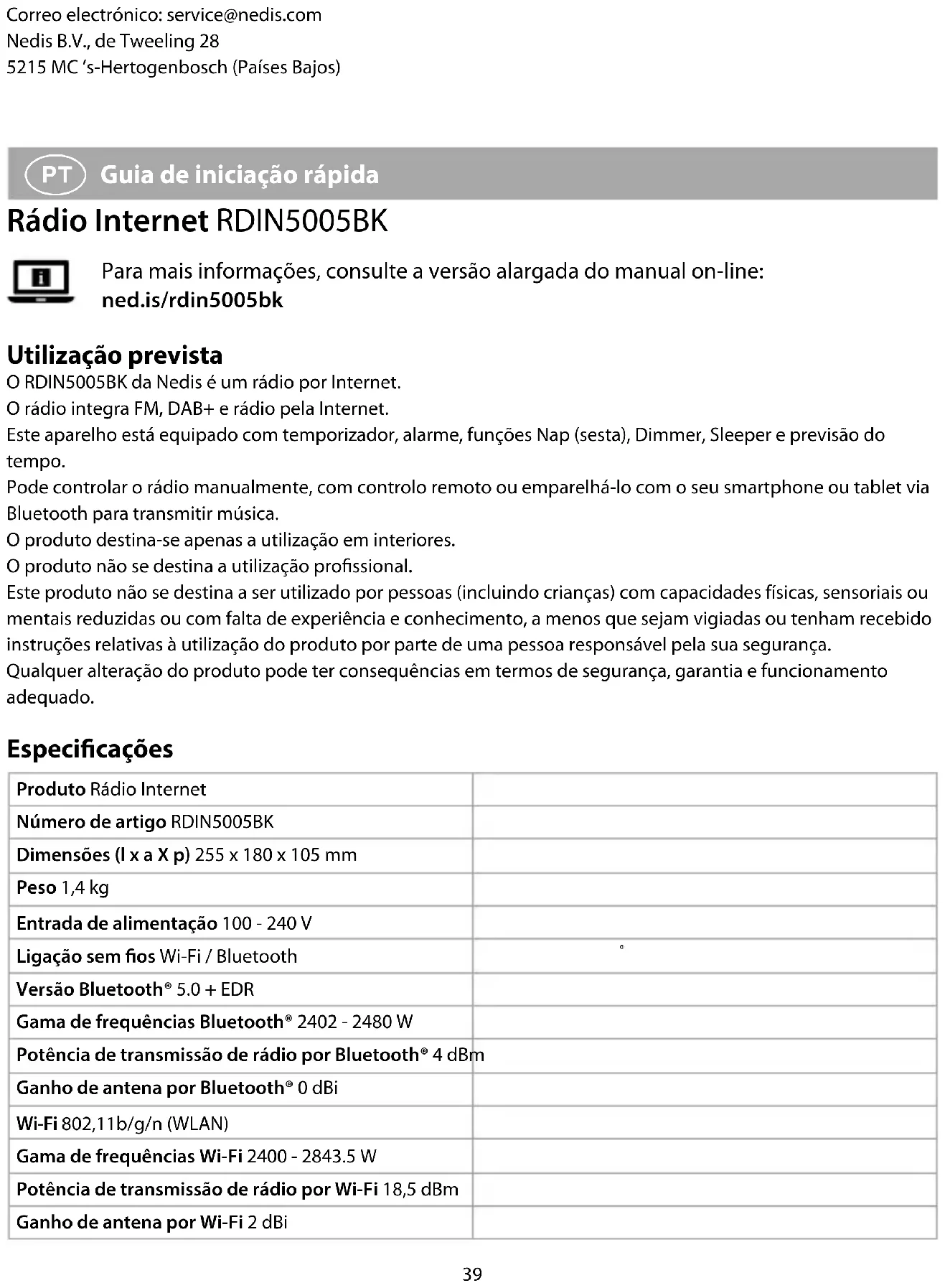 para obter a melhor receção de rádio possível. Se a ligação Wi-Fi for bem sucedida, o visor B q exibirá o menu principal. Rádio Internet Estações de rádio mundiais. Centro de media Acesso aos seus dispositivos UpnP.44 Centro de informação Informação meteorológica, financeira e de sistema.FM Estações de rádio FM.DAB Estações de rádio DAB.Bluetooth Acesso a todos os dispositivos ligados com Bluetooth.Conguração Várias definições de sistema.Rádio local Estações de rádio numa determinada região. O aparelho liga-se automaticamente se voltar a utilizá-lo dentro da rede Wi-Fi.Altere a configuração da rede caso pretenda alterar a rede Wi-Fi. Declaração de conformidade A Nedis B.V. declara, na qualidade de fabricante, que o produto RDIN5005BK da nossa marca Nedis , produzido na China, foi testado em conformidade com todas as normas e regulamentos CE relevantes e que todos os testes foram concluídos com sucesso. Os mesmos incluem, entre outros, o regulamento RED 2014/53/UE.A Declaração de conformidade (e a ficha de dados de segurança, se aplicável) pode ser consultada e descarregada em: nedis.pt/rdin5005bk#supportPara informações adicionais relativas à conformidade, contacte a assistência ao cliente:Site: www.nedis.comE-mail: service@nedis.comNedis B.V., de Tweeling 285215 MC ’s-Hertogenbosch, Países Baixos