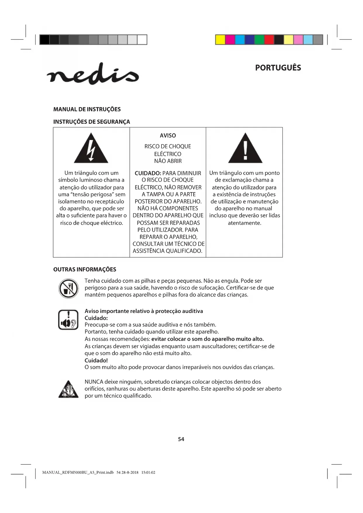 Precauções de segurança: Quando necessitar de reparação e para reduzir o risco de choque eléctrico, este produto deve APENAS ser aberto por um técnico autorizado. Desligar o produto da tomada de alimentação e outro equipamento se ocorrer um problema. Não expor o produto à água ou humidade. Manutenção: Limpar apenas com um pano seco. Não utilizar solventes de limpeza ou produtos abrasivos. Garantia: Não é aceitável qualquer garantia ou responsabilidade devidas a alterações e modicações no produto ou de danos causados pela utilização incorrecta deste produto. Geral: Os designs e as especicações estão sujeitos a alteração sem aviso. Todos os logótipos, marcas e nomes dos produtos são marcas registadas dos respectivos proprietários e são reconhecidas como tal neste documento. Guardar este manual e embalagem para consulta futura. Atenção: Este produto encontra-se marcado com este símbolo. Signica que os produtos eléctricos e electrónicos usados não devem ser misturados com o lixo doméstico geral. Existe um sistema de recolha separado para estes produtos. Este produto foi fabricado e fornecido em conformidade com todos os regulamentos e directivas relevantes, válidos para todos os estados membros da União Europeia. Além disso, está em conformidade com todas as especicações e regulamentos aplicáveis no país de venda. Mediante pedido, será disponibilizada documentação formal. Isto inclui, mas não se limita a: Declaração de Conformidade (e identidade do produto), Ficha de Dados de Segurança de Material e relatório de teste do produto. Contactar o nosso centro de serviço de apoio ao cliente para obter assistência: através do Website: http://www.nedis.pt/pt-pt/contacto/formulario-de-contacto.htm através de e-mail: service@nedis.com através do telefone: +31 (0)73-5993965 (durante o horário normal de expediente) NEDIS B.V., De Tweeling 28, 5215 MC ’s-Hertogenbosch, HOLANDA MANUAL_RDFM5000BU_A5_Print.indb 62 28-8-2018 15:01:0363 MAGYAR