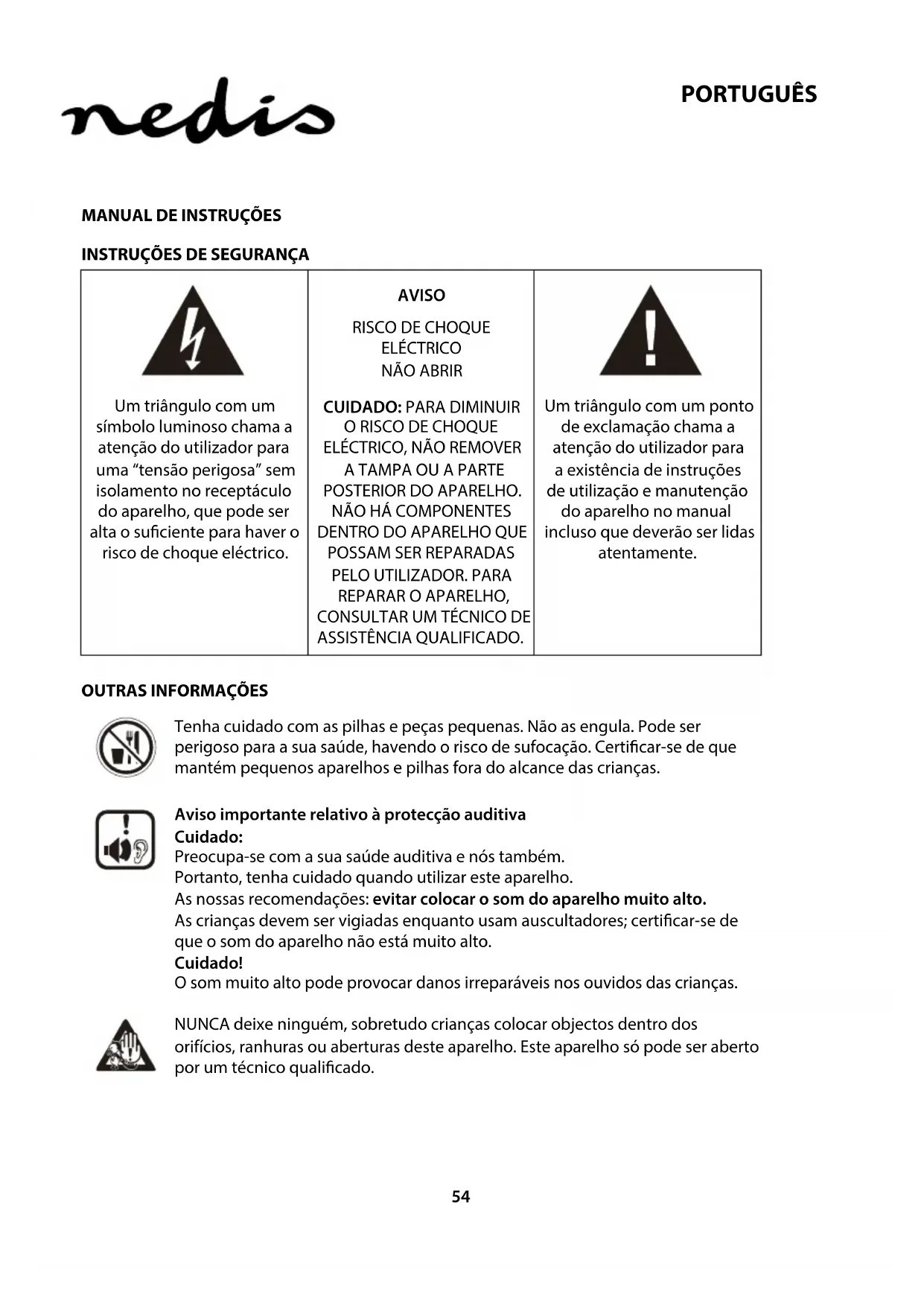 Tenha cuidado com as pilhas e peças pequenas. Não as engula. Pode ser perigoso para a sua saúde, havendo o risco de sufocação. Certicar-se de que mantém pequenos aparelhos e pilhas fora do alcance das crianças. Aviso importante relativo à protecção auditiva Cuidado: Preocupa-se com a sua saúde auditiva e nós também. Portanto, tenha cuidado quando utilizar este aparelho. As nossas recomendações: evitar colocar o som do aparelho muito alto. As crianças devem ser vigiadas enquanto usam auscultadores; certicar-se de que o som do aparelho não está muito alto. Cuidado! O som muito alto pode provocar danos irreparáveis nos ouvidos das crianças. NUNCA deixe ninguém, sobretudo crianças colocar objectos dentro dos orifícios, ranhuras ou aberturas deste aparelho. Este aparelho só pode ser aberto por um técnico qualicado.55 PORTUGUÊS Só utilizar este aparelho para a sua função especíca. Este aparelho só pode ser utilizado em residências e em espaços comerciais. Guardar este manual de instruções para referência futura. Instruções relativas à protecção ambiental Não deitar este produto no caixote do lixo doméstico quando o aparelho deixar de funcionar; entregue-o num centro de recolha para a reciclagem de aparelhos electrónicos e eléctricos. O símbolo contido no produto e as instruções de utilização existentes na embalagem, informá-lo-ão acerca dos métodos existentes para eliminação do aparelho. Os componentes do aparelho são recicláveis, como o mencionado na simbologia existente no aparelho. Ao reciclar componentes ou outras formas de reutilização de aparelhos antigos, está a dar uma contribuição importante para proteger o nosso meio ambiente. Contactar a Câmara Municipal ou a Junta de Freguesia local para car a conhecer a localização dos centros autorizados para eliminação de aparelhos cujo prazo de funcionamento expirou. Não obstruir o sistema de ventilação do aparelho. Certicar-se de que não há cortinas, jornais, mobílias ou outro tipo de objectos a bloquear o sistema de ventilação do aparelho. Não pode haver objectos a bloquear o sistema de ventilação! O sobreaquecimento pode provocar danos graves no aparelho e reduzir o seu desempenho e durabilidade. Temperatura Não expor o aparelho à luz solar directa. Certicar-se de que o aparelho não é sujeito a fontes de calor directo, como por exemplo aquecedores ou chamas. Certicar-se de que as ranhuras de ventilação do aparelho não estão tapadas. Humidade e limpeza Este aparelho não é a prova de água! Não imergir a componente de reprodução sonora dentro de água. Manter a componente de reprodução sonora num local seco. Se entrar água no interior da componente de reprodução sonora, pode provocar danos graves. Não utilizar produtos de limpeza que contenham álcool, amoníaco, benzina ou abrasivos, porque podem danicar a componente de reprodução sonora. Para limpar a componente de reprodução sonora, utilizar um pano macio e humidicado.56 PORTUGUÊS Reciclagem prossional As pilhas e a embalagem do aparelho não devem ser deitadas para o lixo. As pilhas têm de ser entregues num centro de recolha para pilhas esgotadas. Separar materiais da embalagem passíveis de serem eliminados é uma atitude amiga do meio ambiente.