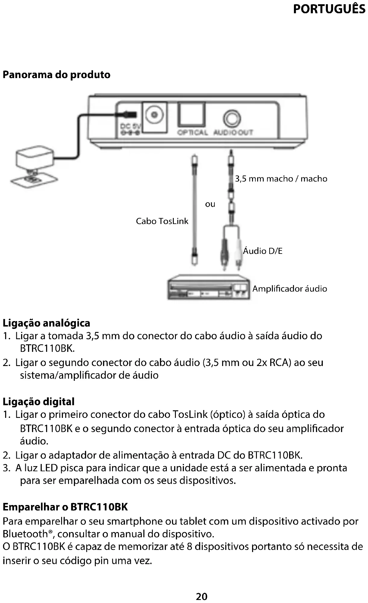dispositivo. Indicação LED Indicação Signicado Descrição Pisca em cada 5segundos Emparelhamento Procurar o dispositivo no modo de emparelhamento/aguardar por uma ligação Sempre ligada Ligado O BTRC110BK e o dispositivo estão ligados Resolução de problemas Se não ouvir qualquer som dos altifalantes, vericar o seguinte: - assegurar que o BTRC110BK está ligado; - assegurar que o cabo áudio está correctamente ligado ao BTRC110BK; - assegurar que a fonte de áudio no seu amplicador está a funcionar adequadamente; - assegurar que nível de volume está sucientemente alto; - assegurar que os dispositivos estão a uma distância máxima de 10 metros do transmissor áudio; - assegurar que a função Bluetooth® está activada no seu dispositivo; - assegurar que o seu dispositivo está a reproduzir música.PORTUGUÊS