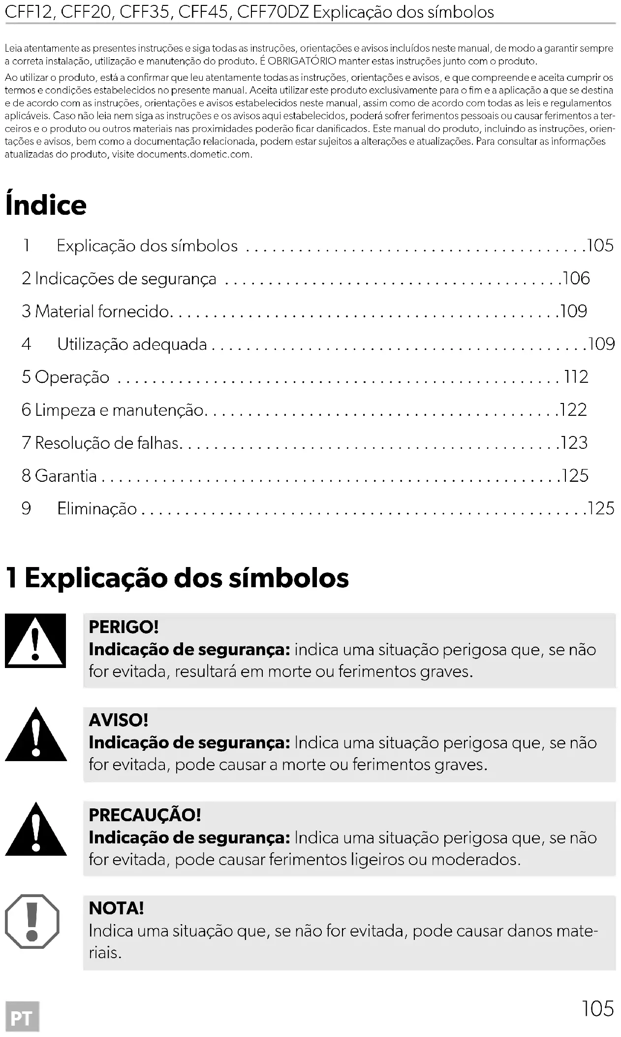 PERIGO! Indicação de segurança: indica uma situação perigosa que, se não for evitada, resultará em morte ou ferimentos graves. AVISO! Indicação de segurança: Indica uma situação perigosa que, se não for evitada, pode causar a morte ou ferimentos graves. PRECAUÇÃO! Indicação de segurança: Indica uma situação perigosa que, se não for evitada, pode causar ferimentos ligeiros ou moderados. NOTA! Indica uma situação que, se não for evitada, pode causar danos mate- riais. DometicCFF12-20-35-45-70DZ_OPM_4445103134_EMEA17_202x-xx-xx.book Page 105 Friday, September 16, 2022 12:19 PMPT Indicações de segurança CFF12, CFF20, CFF35, CFF45, CFF70DZ