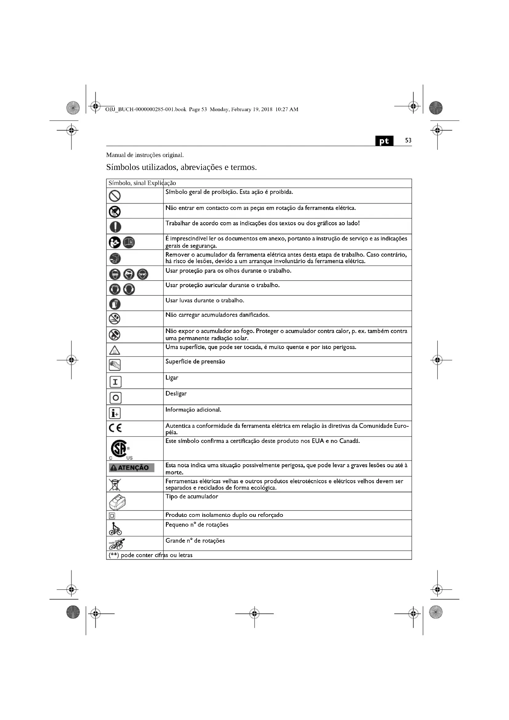 Manual de instruções original. Símbolos utilizados, abreviações e termos. Símbolo, sinal Explicação Símbolo geral de proibição. Esta ação é proibida. Não entrar em contacto com as peças em rotação da ferramenta elétrica. Trabalhar de acordo com as indicações dos textos ou dos gráficos ao lado! É imprescindível ler os documentos em anexo, portanto a instrução de serviço e as indicações gerais de segurança. Remover o acumulador da ferramenta elétrica antes desta etapa de trabalho. Caso contrário, há risco de lesões, devido a um arranque involuntário da ferramenta elétrica. Usar proteção para os olhos durante o trabalho. Usar proteção auricular durante o trabalho. Usar luvas durante o trabalho. Não carregar acumuladores danificados. Não expor o acumulador ao fogo. Proteger o acumulador contra calor, p. ex. também contra uma permanente radiação solar. Uma superfície, que pode ser tocada, é muito quente e por isto perigosa. Superfície de preensão Ligar Desligar Informação adicional. Autentica a conformidade da ferramenta elétrica em relação às diretivas da Comunidade Euro- péia. Este símbolo confirma a certificação deste produto nos EUA e no Canadá. Esta nota indica uma situação possivelmente perigosa, que pode levar a graves lesões ou até à morte. Ferramentas elétricas velhas e outros produtos eletrotécnicos e elétricos velhos devem ser separados e reciclados de forma ecológica. Tipo de acumulador Produto com isolamento duplo ou reforçado Pequeno n° de rotações Grande n° de rotações (**) pode conter cifras ou letras OBJ_BUCH-0000000285-001.book Page 53 Monday, February 19, 2018 10:27 AM54