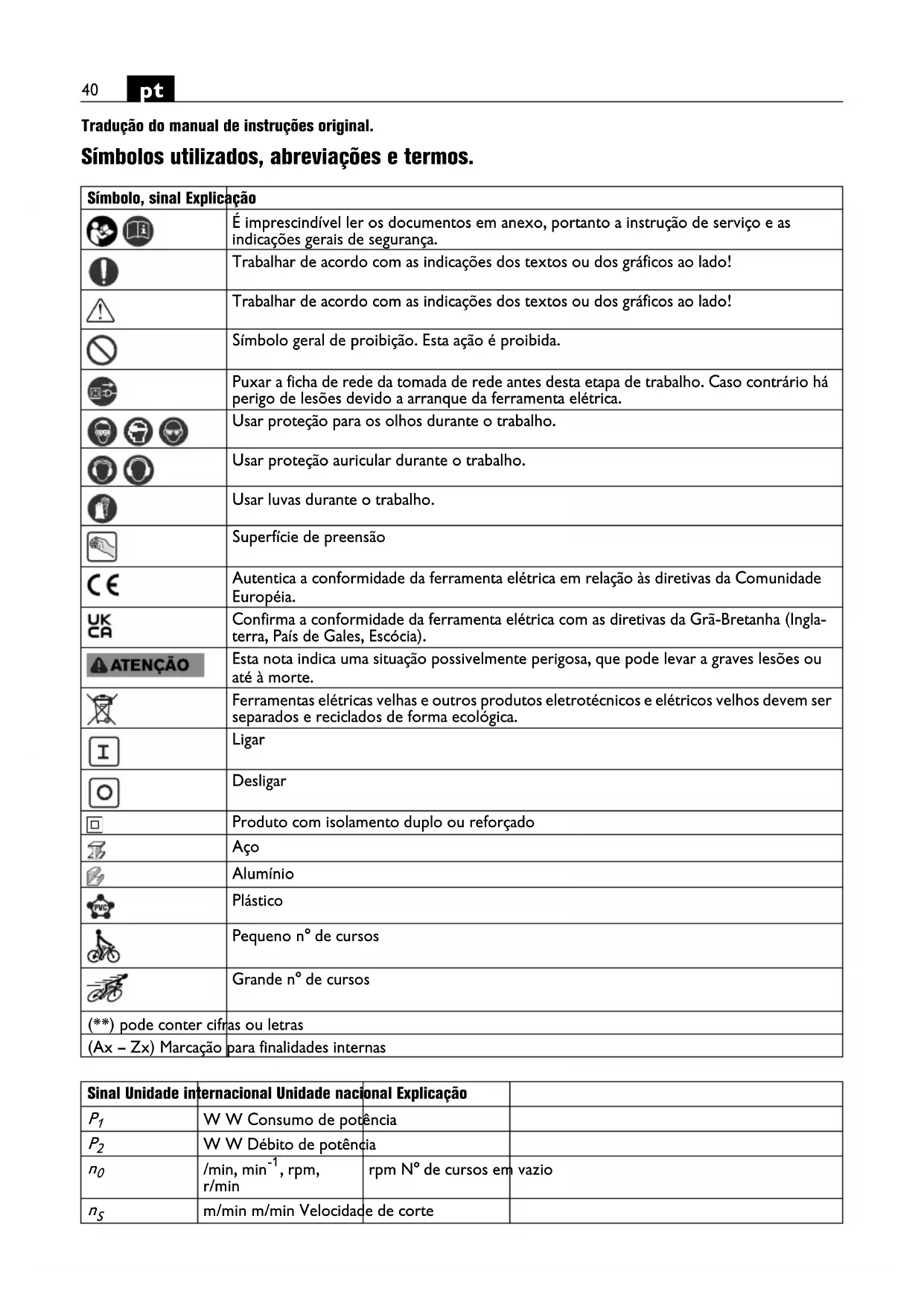 Tradução do manual de instruções original. Símbolos utilizados, abreviações e termos. Símbolo, sinal Explicação É imprescindível ler os documentos em anexo, portanto a instrução de serviço e as indicações gerais de segurança. Trabalhar de acordo com as indicações dos textos ou dos gráficos ao lado! Trabalhar de acordo com as indicações dos textos ou dos gráficos ao lado! Símbolo geral de proibição. Esta ação é proibida. Puxar a ficha de rede da tomada de rede antes desta etapa de trabalho. Caso contrário há perigo de lesões devido a arranque da ferramenta elétrica. Usar proteção para os olhos durante o trabalho. Usar proteção auricular durante o trabalho. Usar luvas durante o trabalho. Superfície de preensão Autentica a conformidade da ferramenta elétrica em relação às diretivas da Comunidade Européia. Confirma a conformidade da ferramenta elétrica com as diretivas da Grã-Bretanha (Ingla- terra, País de Gales, Escócia). Esta nota indica uma situação possivelmente perigosa, que pode levar a graves lesões ou até à morte. Ferramentas elétricas velhas e outros produtos eletrotécnicos e elétricos velhos devem ser separados e reciclados de forma ecológica. Ligar Desligar Produto com isolamento duplo ou reforçado Aço Alumínio Plástico Pequeno n° de cursos Grande n° de cursos (**) pode conter cifras ou letras (Ax – Zx) Marcação para finalidades internas Sinal Unidade internacional Unidade nacional Explicação