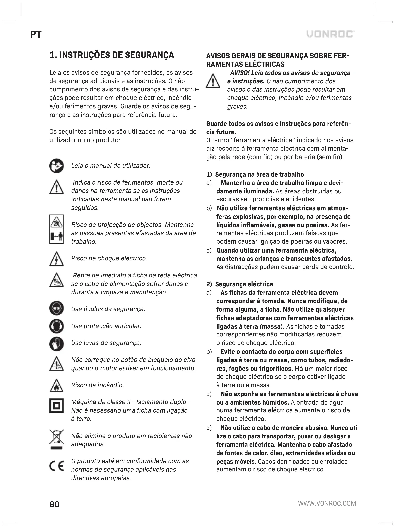 Antes de efectuar a limpeza e a manutenção, desligue sempre a máquina e retire a ficha de alimentação da tomada de corrente. Limpe a caixa da máquina com regularidade com um pano macio, de preferência após cada utili- zação. Certifique-se de que as aberturas de ventila- ção não têm pó ou sujidade. Retire a sujidade muito persistente com um pano macio humedecido com água de sabão. Não utilize solventes, como gasolina, álcool, amoníaco, etc. Este tipo de produtos químicos danificam os com- ponentes sintéticos. AMBIENTE Os equipamentos eléctricos ou electrónicos defeituosos e/ou eliminados devem ser recolhi- dos em locais de reciclagem adequados. Apenas para os países da CE Não elimine as ferramentas eléctricas em conjunto com os resíduos domésticos. De acordo com a directiva europeia 2012/19/UE sobre resíduos de equipamentos eléctricos e electrónicos e a res- pectiva implementação na legislação nacional, as ferramentas eléctricas que já não sejam utilizadas devem ser recolhidas em separado e eliminadas de maneira ecológica. GARANTIA Os produtos da VONROC são desenvolvidos de acordo com os padrões de qualidade mais ele- vados e não apresentam quaisquer defeitos em termos de materiais e mão-de-obra em relação ao período estipulado por lei, cujo início é a partir da data de compra original. Se o produto apresen- tar qualquer falha durante este período devido a qualquer defeito no material e/ou de mão-de-obra, contacte a VONROC directamente. As seguintes circunstâncias estão excluídas desta garantia: