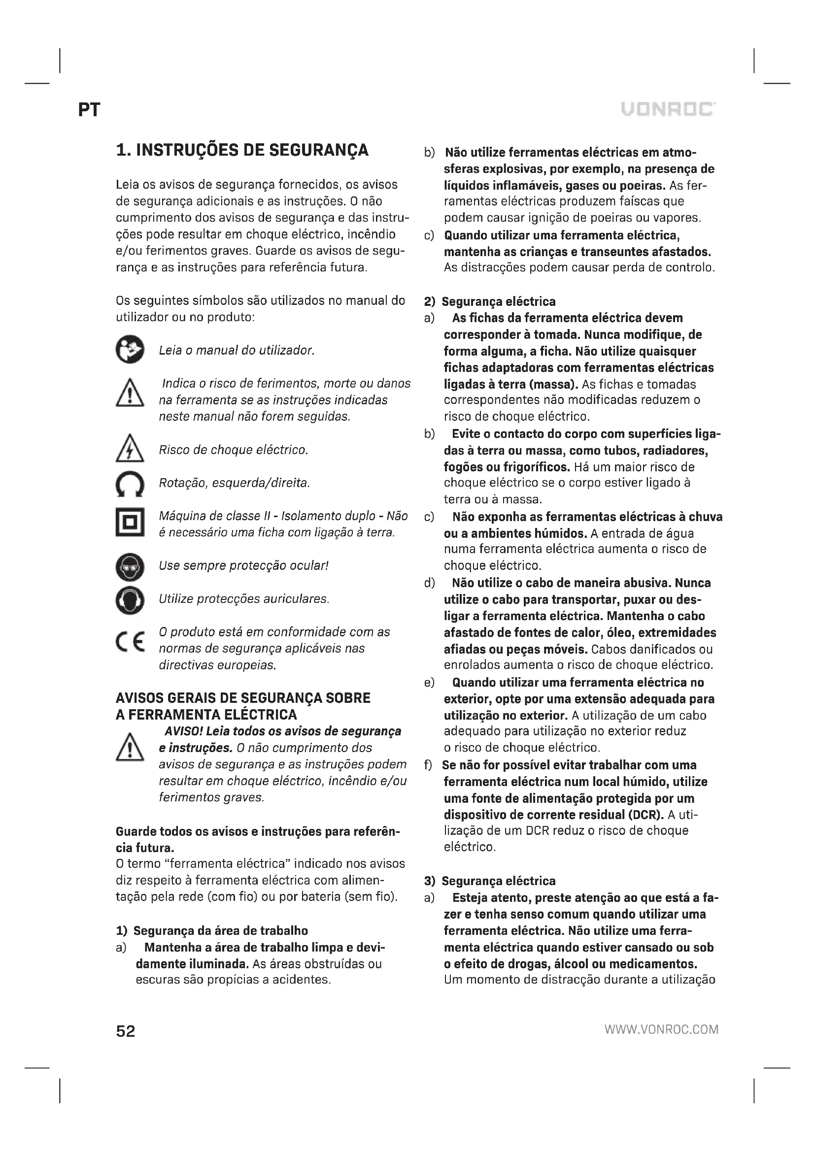 Antes de efectuar a limpeza e a manuten- ção, desligue sempre a máquina e retire a ficha da tomada de corrente. Limpe a caixa da máquina com frequência com um pano macio, de preferência após cada utilização. Assegure-se de que as aberturas de ventilação não têm pó ou sujidade. Retire a sujidade muito persis- tente com um pano macio humedecido com água de sabão. Não utilize solventes, como gasolina, álcool, amoníaco, etc. Este tipo de produtos quími- cos danificam os componentes sintéticos. AMBIENTE Os equipamentos eléctricos ou electrónicos defeituosos e/ou eliminados devem ser recolhidos em locais de reciclagem adequados. Apenas para os países da CE Não elimine as ferramentas eléctricas em conjunto com os resíduos domésticos. De acordo com a directiva europeia 2012/19/CE sobre resíduos de equipamentos eléctricos e electrónicos e a res- pectiva implementação na legislação nacional, as ferramentas eléctricas que já não sejam utilizadas devem ser recolhidas em separado e eliminadas de maneira ecológica. GARANTIA Os produtos da VONROC são desenvolvidos de acordo com os padrões de qualidade mais ele- vados e não apresentam quaisquer defeitos em termos de materiais e mão-de-obra em relação ao período estipulado por lei, cujo início é a partir da data de compra original. Se o produto apresen- tar qualquer falha durante este período devido a qualquer defeito no material e/ou de mão-de-obra, contacte a VONROC directamente. As seguintes circunstâncias estão excluídas desta garantia: