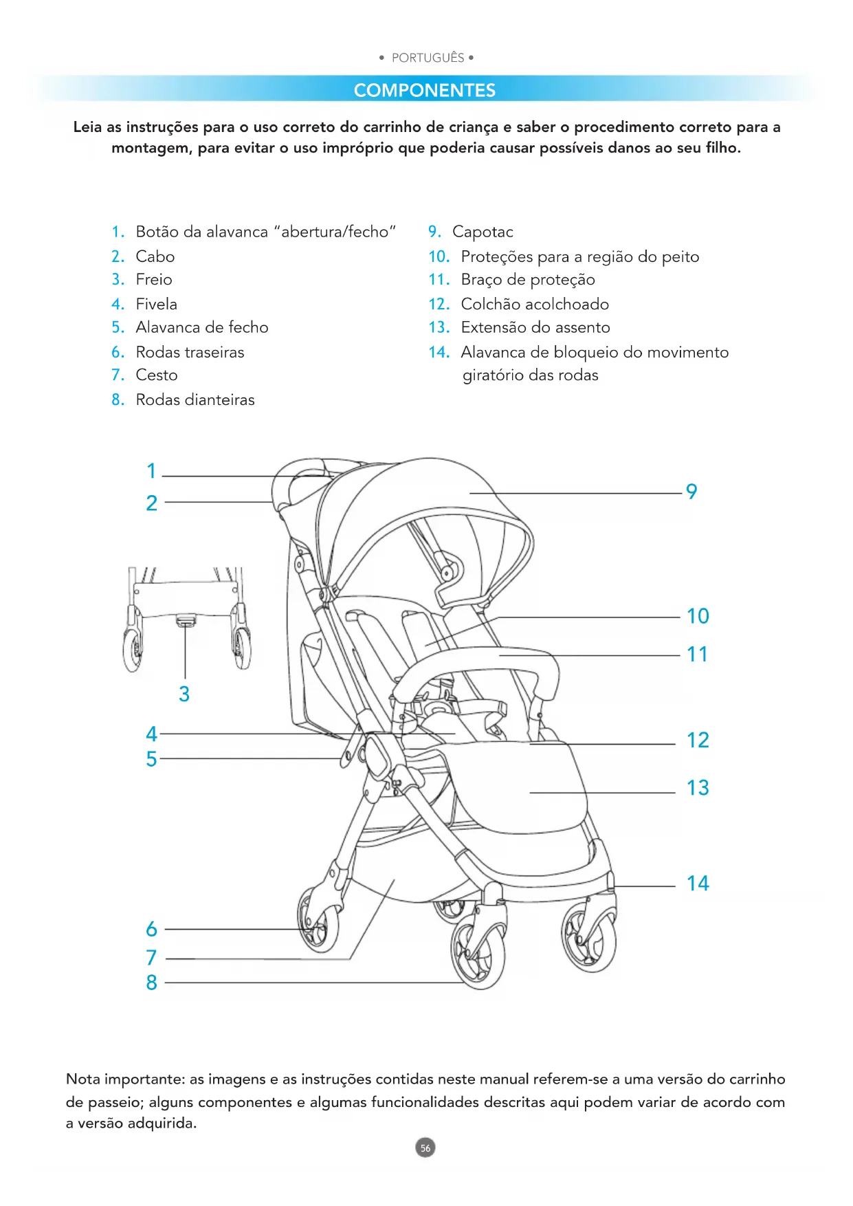 giratório das rodas Nota importante: as imagens e as instruções contidas neste manual referem-se a uma versão do carrinho de passeio; alguns componentes e algumas funcionalidades descritas aqui podem variar de acordo com a versão adquirida. Leia as instruções para o uso correto do carrinho de criança e saber o procedimento correto para a montagem, para evitar o uso impróprio que poderia causar possíveis danos ao seu lho.