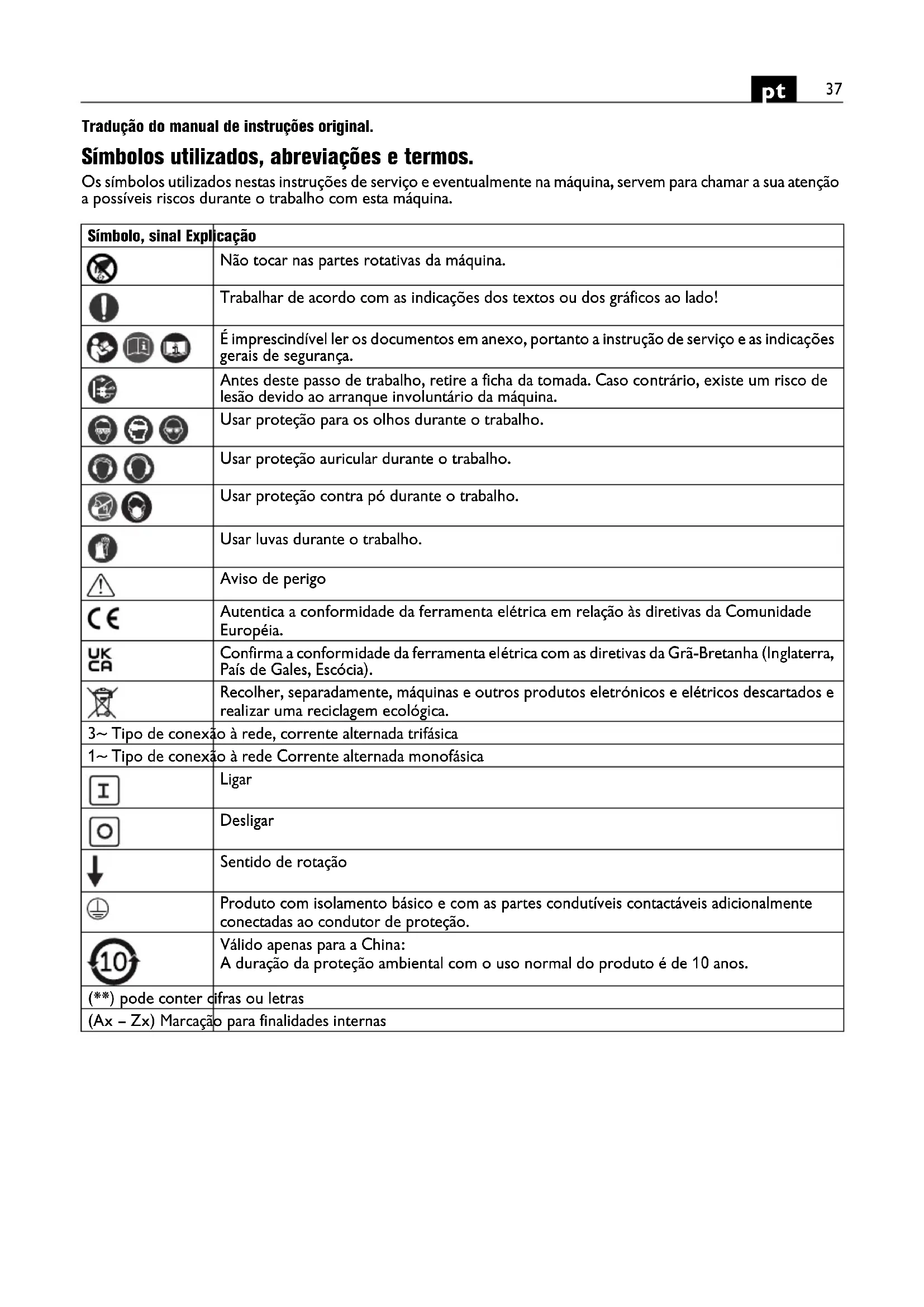 Tradução do manual de instruções original. Símbolos utilizados, abreviações e termos. Os símbolos utilizados nestas instruções de serviço e eventualmente na máquina, servem para chamar a sua atenção a possíveis riscos durante o trabalho com esta máquina. Símbolo, sinal Explicação Não tocar nas partes rotativas da máquina. Trabalhar de acordo com as indicações dos textos ou dos gráficos ao lado! É imprescindível ler os documentos em anexo, portanto a instrução de serviço e as indicações gerais de segurança. Antes deste passo de trabalho, retire a ficha da tomada. Caso contrário, existe um risco de lesão devido ao arranque involuntário da máquina. Usar proteção para os olhos durante o trabalho. Usar proteção auricular durante o trabalho. Usar proteção contra pó durante o trabalho. Usar luvas durante o trabalho. Aviso de perigo Autentica a conformidade da ferramenta elétrica em relação às diretivas da Comunidade Européia. Confirma a conformidade da ferramenta elétrica com as diretivas da Grã-Bretanha (Inglaterra, País de Gales, Escócia). Recolher, separadamente, máquinas e outros produtos eletrónicos e elétricos descartados e realizar uma reciclagem ecológica. 3~ Tipo de conexão à rede, corrente alternada trifásica 1~ Tipo de conexão à rede Corrente alternada monofásica Ligar Desligar Sentido de rotação Produto com isolamento básico e com as partes condutíveis contactáveis adicionalmente conectadas ao condutor de proteção. Válido apenas para a China: A duração da proteção ambiental com o uso normal do produto é de 10 anos. (**) pode conter cifras ou letras (Ax – Zx) Marcação para finalidades internas38