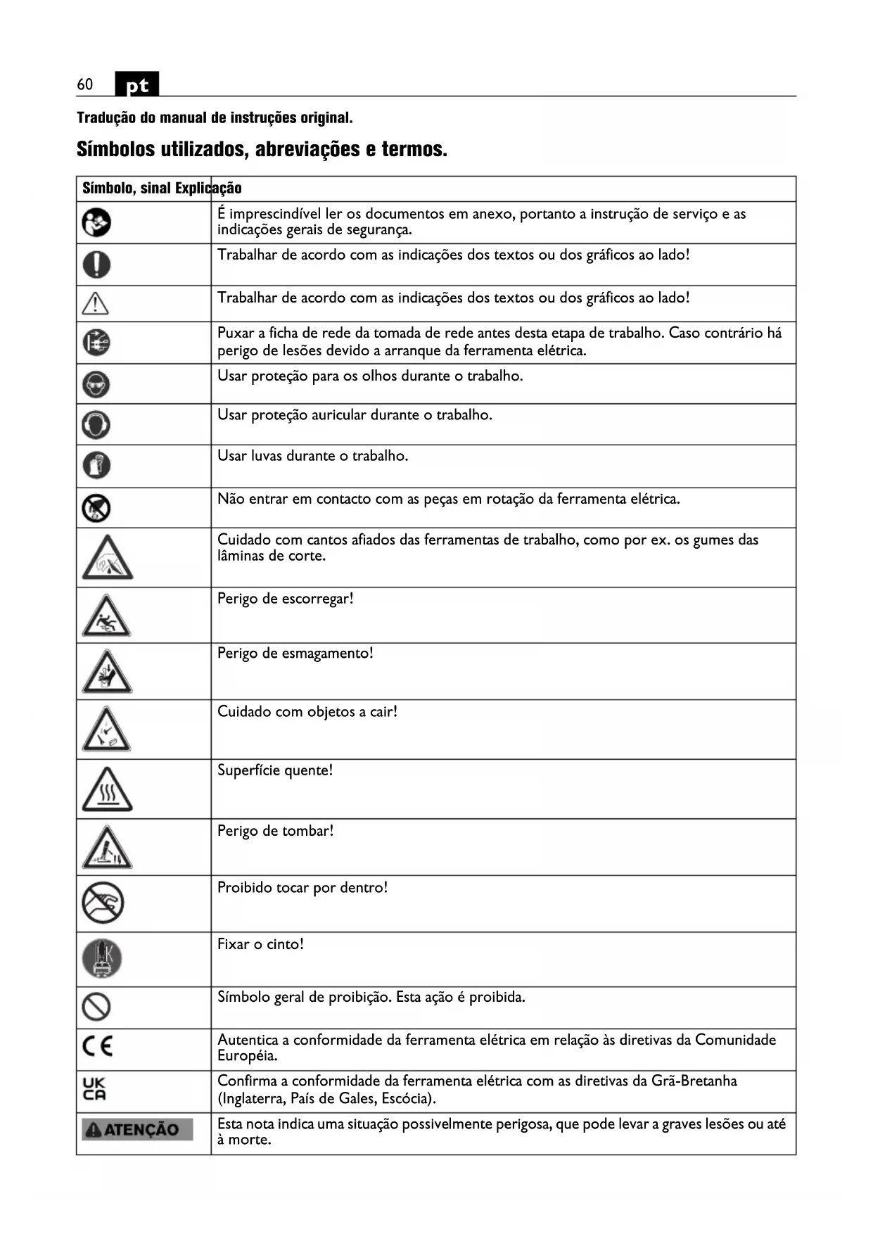 Tradução do manual de instruções original. Símbolos utilizados, abreviações e termos. Símbolo, sinal Explicação É imprescindível ler os documentos em anexo, portanto a instrução de serviço e as indicações gerais de segurança. Trabalhar de acordo com as indicações dos textos ou dos gráficos ao lado! Trabalhar de acordo com as indicações dos textos ou dos gráficos ao lado! Puxar a ficha de rede da tomada de rede antes desta etapa de trabalho. Caso contrário há perigo de lesões devido a arranque da ferramenta elétrica. Usar proteção para os olhos durante o trabalho. Usar proteção auricular durante o trabalho. Usar luvas durante o trabalho. Não entrar em contacto com as peças em rotação da ferramenta elétrica. Cuidado com cantos afiados das ferramentas de trabalho, como por ex. os gumes das lâminas de corte. Perigo de escorregar! Perigo de esmagamento! Cuidado com objetos a cair! Superfície quente! Perigo de tombar! Proibido tocar por dentro! Fixar o cinto! Símbolo geral de proibição. Esta ação é proibida. Autentica a conformidade da ferramenta elétrica em relação às diretivas da Comunidade Européia. Confirma a conformidade da ferramenta elétrica com as diretivas da Grã-Bretanha (Inglaterra, País de Gales, Escócia). Esta nota indica uma situação possivelmente perigosa, que pode levar a graves lesões ou até à morte.61