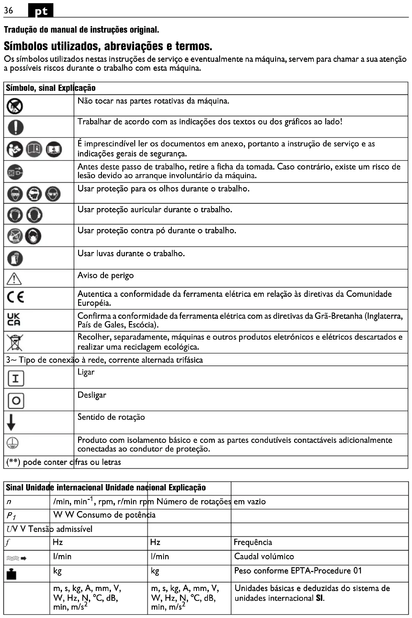 Tradução do manual de instruções original. Símbolos utilizados, abreviações e termos. Os símbolos utilizados nestas instruções de serviço e eventualmente na máquina, servem para chamar a sua atenção a possíveis riscos durante o trabalho com esta máquina. Símbolo, sinal Explicação Não tocar nas partes rotativas da máquina. Trabalhar de acordo com as indicações dos textos ou dos gráficos ao lado! É imprescindível ler os documentos em anexo, portanto a instrução de serviço e as indicações gerais de segurança. Antes deste passo de trabalho, retire a ficha da tomada. Caso contrário, existe um risco de lesão devido ao arranque involuntário da máquina. Usar proteção para os olhos durante o trabalho. Usar proteção auricular durante o trabalho. Usar proteção contra pó durante o trabalho. Usar luvas durante o trabalho. Aviso de perigo Autentica a conformidade da ferramenta elétrica em relação às diretivas da Comunidade Européia. Confirma a conformidade da ferramenta elétrica com as diretivas da Grã-Bretanha (Inglaterra, País de Gales, Escócia). Recolher, separadamente, máquinas e outros produtos eletrónicos e elétricos descartados e realizar uma reciclagem ecológica. 3~ Tipo de conexão à rede, corrente alternada trifásica Ligar Desligar Sentido de rotação Produto com isolamento básico e com as partes condutíveis contactáveis adicionalmente conectadas ao condutor de proteção. (**) pode conter cifras ou letras Sinal Unidade internacional Unidade nacional Explicação