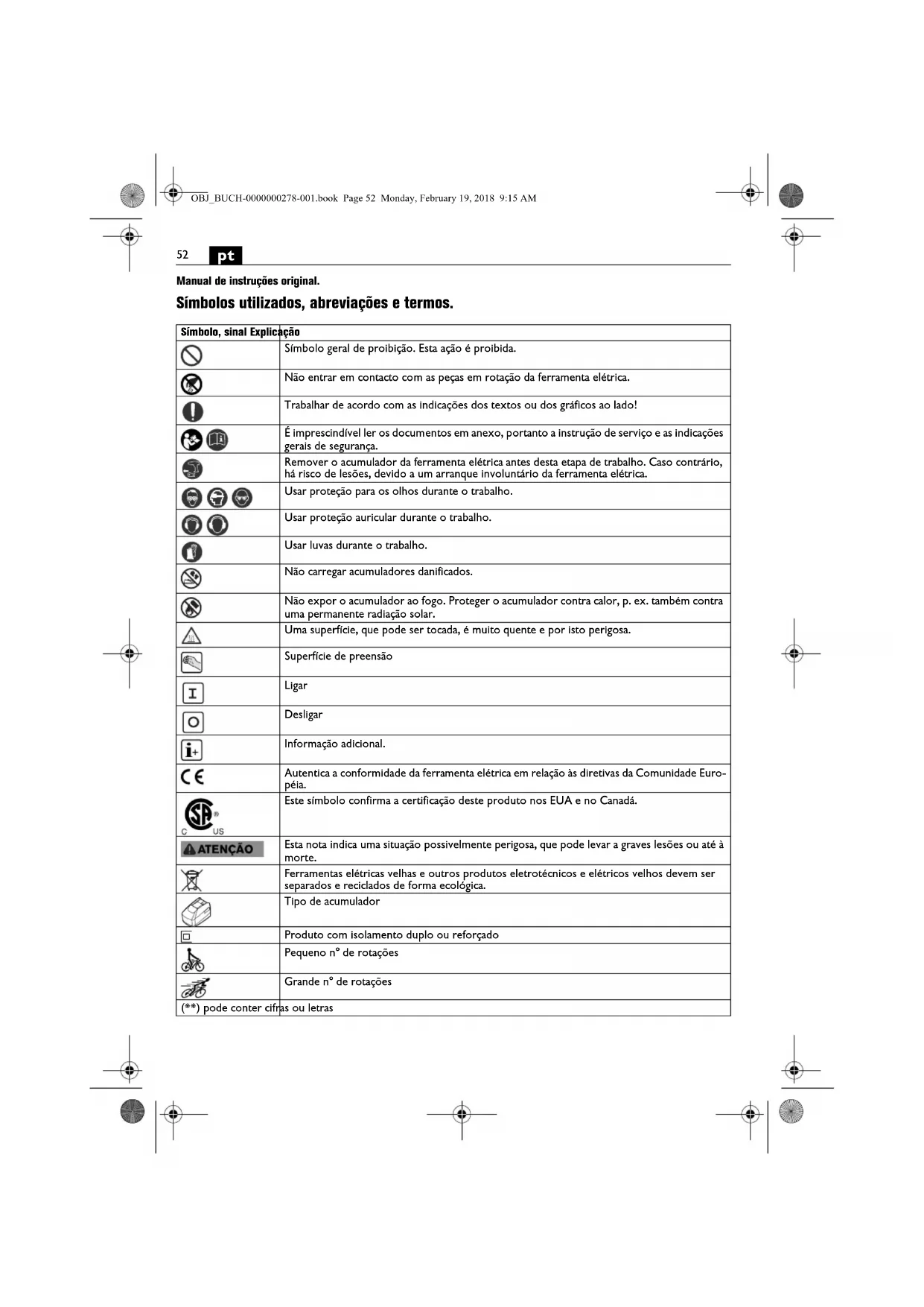 Manual de instruções original. Símbolos utilizados, abreviações e termos. Símbolo, sinal Explicação Símbolo geral de proibição. Esta ação é proibida. Não entrar em contacto com as peças em rotação da ferramenta elétrica. Trabalhar de acordo com as indicações dos textos ou dos gráficos ao lado! É imprescindível ler os documentos em anexo, portanto a instrução de serviço e as indicações gerais de segurança. Remover o acumulador da ferramenta elétrica antes desta etapa de trabalho. Caso contrário, há risco de lesões, devido a um arranque involuntário da ferramenta elétrica. Usar proteção para os olhos durante o trabalho. Usar proteção auricular durante o trabalho. Usar luvas durante o trabalho. Não carregar acumuladores danificados. Não expor o acumulador ao fogo. Proteger o acumulador contra calor, p. ex. também contra uma permanente radiação solar. Uma superfície, que pode ser tocada, é muito quente e por isto perigosa. Superfície de preensão Ligar Desligar Informação adicional. Autentica a conformidade da ferramenta elétrica em relação às diretivas da Comunidade Euro- péia. Este símbolo confirma a certificação deste produto nos EUA e no Canadá. Esta nota indica uma situação possivelmente perigosa, que pode levar a graves lesões ou até à morte. Ferramentas elétricas velhas e outros produtos eletrotécnicos e elétricos velhos devem ser separados e reciclados de forma ecológica. Tipo de acumulador Produto com isolamento duplo ou reforçado Pequeno n° de rotações Grande n° de rotações (**) pode conter cifras ou letras OBJ_BUCH-0000000278-001.book Page 52 Monday, February 19, 2018 9:15 AM53