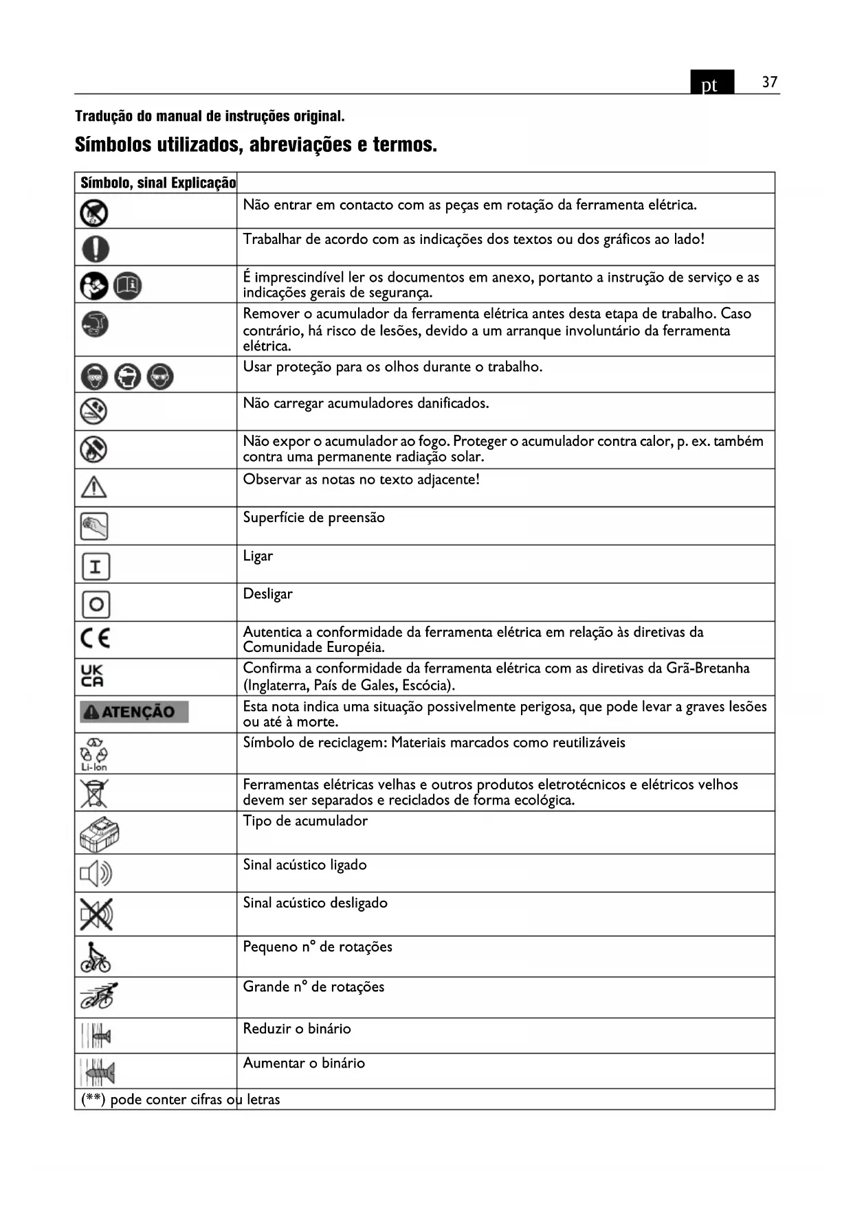 Tradução do manual de instruções original. Símbolos utilizados, abreviações e termos. Símbolo, sinal Explicação Não entrar em contacto com as peças em rotação da ferramenta elétrica. Trabalhar de acordo com as indicações dos textos ou dos gráficos ao lado! É imprescindível ler os documentos em anexo, portanto a instrução de serviço e as indicações gerais de segurança. Remover o acumulador da ferramenta elétrica antes desta etapa de trabalho. Caso contrário, há risco de lesões, devido a um arranque involuntário da ferramenta elétrica. Usar proteção para os olhos durante o trabalho. Não carregar acumuladores danificados. Não expor o acumulador ao fogo. Proteger o acumulador contra calor, p. ex. também contra uma permanente radiação solar. Observar as notas no texto adjacente! Superfície de preensão Ligar Desligar Autentica a conformidade da ferramenta elétrica em relação às diretivas da Comunidade Européia. Confirma a conformidade da ferramenta elétrica com as diretivas da Grã-Bretanha (Inglaterra, País de Gales, Escócia). Esta nota indica uma situação possivelmente perigosa, que pode levar a graves lesões ou até à morte. Símbolo de reciclagem: Materiais marcados como reutilizáveis Ferramentas elétricas velhas e outros produtos eletrotécnicos e elétricos velhos devem ser separados e reciclados de forma ecológica. Tipo de acumulador Sinal acústico ligado Sinal acústico desligado Pequeno n° de rotações Grande n° de rotações Reduzir o binário Aumentar o binário (**) pode conter cifras ou letras38