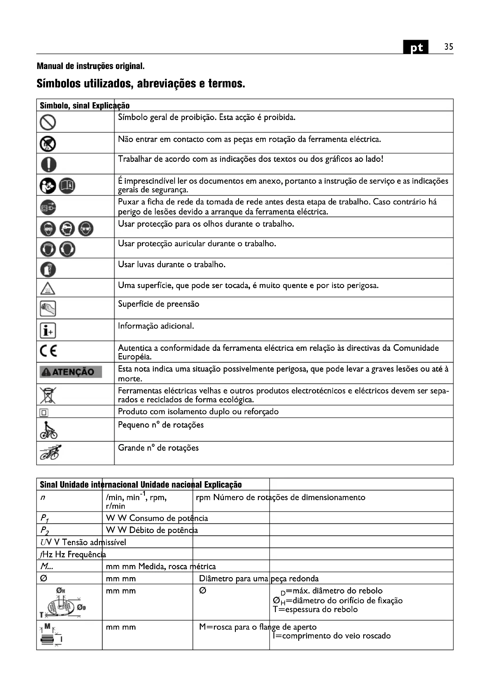 Manual de instruções original. Símbolos utilizados, abreviações e termos. Símbolo, sinal Explicação Símbolo geral de proibição. Esta acção é proibida. Não entrar em contacto com as peças em rotação da ferramenta eléctrica. Trabalhar de acordo com as indicações dos textos ou dos gráficos ao lado! É imprescindível ler os documentos em anexo, portanto a instrução de serviço e as indicações gerais de segurança. Puxar a ficha de rede da tomada de rede antes desta etapa de trabalho. Caso contrário há perigo de lesões devido a arranque da ferramenta eléctrica. Usar protecção para os olhos durante o trabalho. Usar protecção auricular durante o trabalho. Usar luvas durante o trabalho. Uma superfície, que pode ser tocada, é muito quente e por isto perigosa. Superfície de preensão Informação adicional. Autentica a conformidade da ferramenta eléctrica em relação às directivas da Comunidade Européia. Esta nota indica uma situação possivelmente perigosa, que pode levar a graves lesões ou até à morte. Ferramentas eléctricas velhas e outros produtos electrotécnicos e eléctricos devem ser sepa- rados e reciclados de forma ecológica. Produto com isolamento duplo ou reforçado Pequeno n° de rotações Grande n° de rotações Sinal Unidade internacional Unidade nacional Explicação