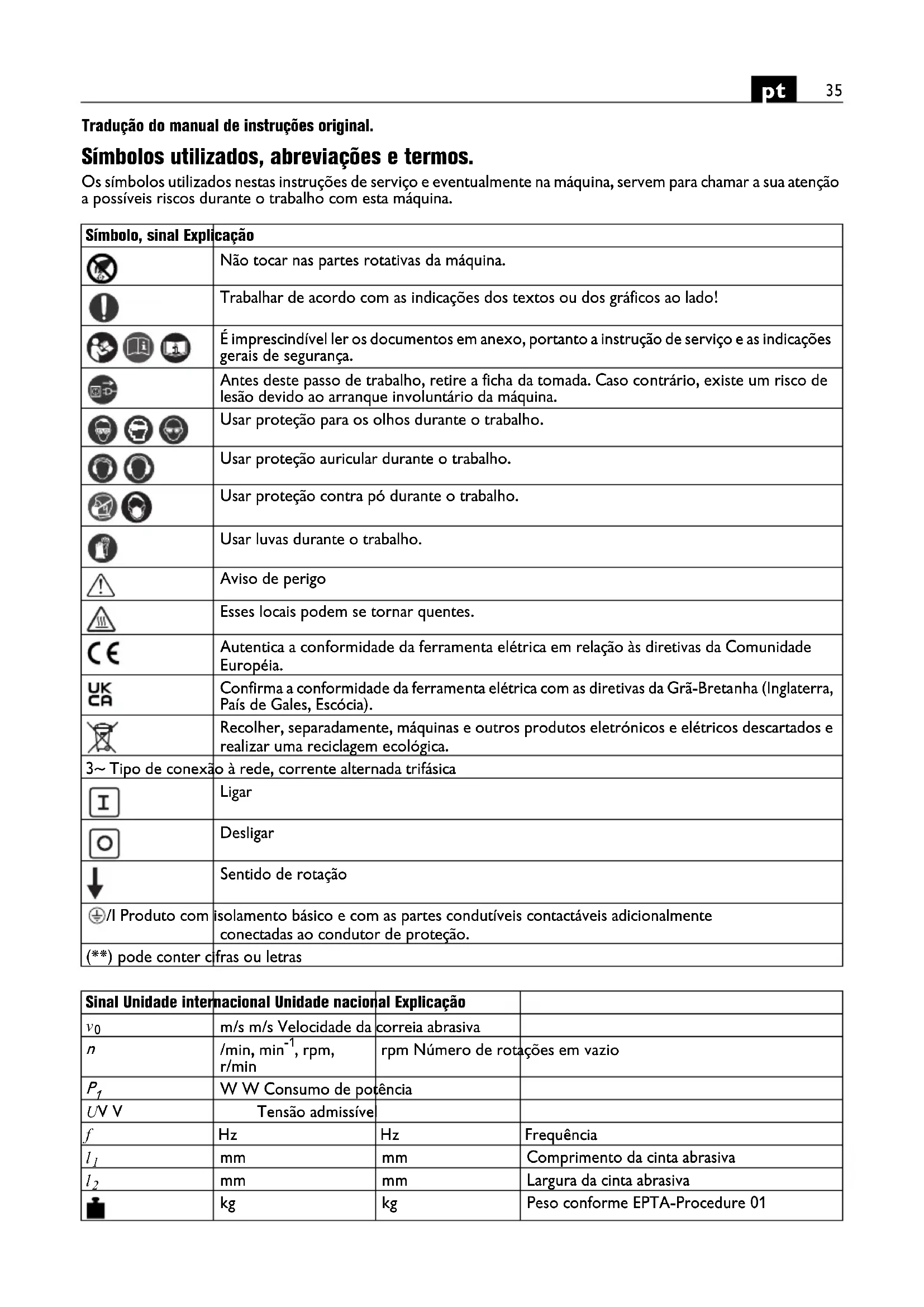 Tradução do manual de instruções original. Símbolos utilizados, abreviações e termos. Os símbolos utilizados nestas instruções de serviço e eventualmente na máquina, servem para chamar a sua atenção a possíveis riscos durante o trabalho com esta máquina. Símbolo, sinal Explicação Não tocar nas partes rotativas da máquina. Trabalhar de acordo com as indicações dos textos ou dos gráficos ao lado! É imprescindível ler os documentos em anexo, portanto a instrução de serviço e as indicações gerais de segurança. Antes deste passo de trabalho, retire a ficha da tomada. Caso contrário, existe um risco de lesão devido ao arranque involuntário da máquina. Usar proteção para os olhos durante o trabalho. Usar proteção auricular durante o trabalho. Usar proteção contra pó durante o trabalho. Usar luvas durante o trabalho. Aviso de perigo Esses locais podem se tornar quentes. Autentica a conformidade da ferramenta elétrica em relação às diretivas da Comunidade Européia. Confirma a conformidade da ferramenta elétrica com as diretivas da Grã-Bretanha (Inglaterra, País de Gales, Escócia). Recolher, separadamente, máquinas e outros produtos eletrónicos e elétricos descartados e realizar uma reciclagem ecológica. 3~ Tipo de conexão à rede, corrente alternada trifásica Ligar Desligar Sentido de rotação /I Produto com isolamento básico e com as partes condutíveis contactáveis adicionalmente conectadas ao condutor de proteção. (**) pode conter cifras ou letras Sinal Unidade internacional Unidade nacional Explicação