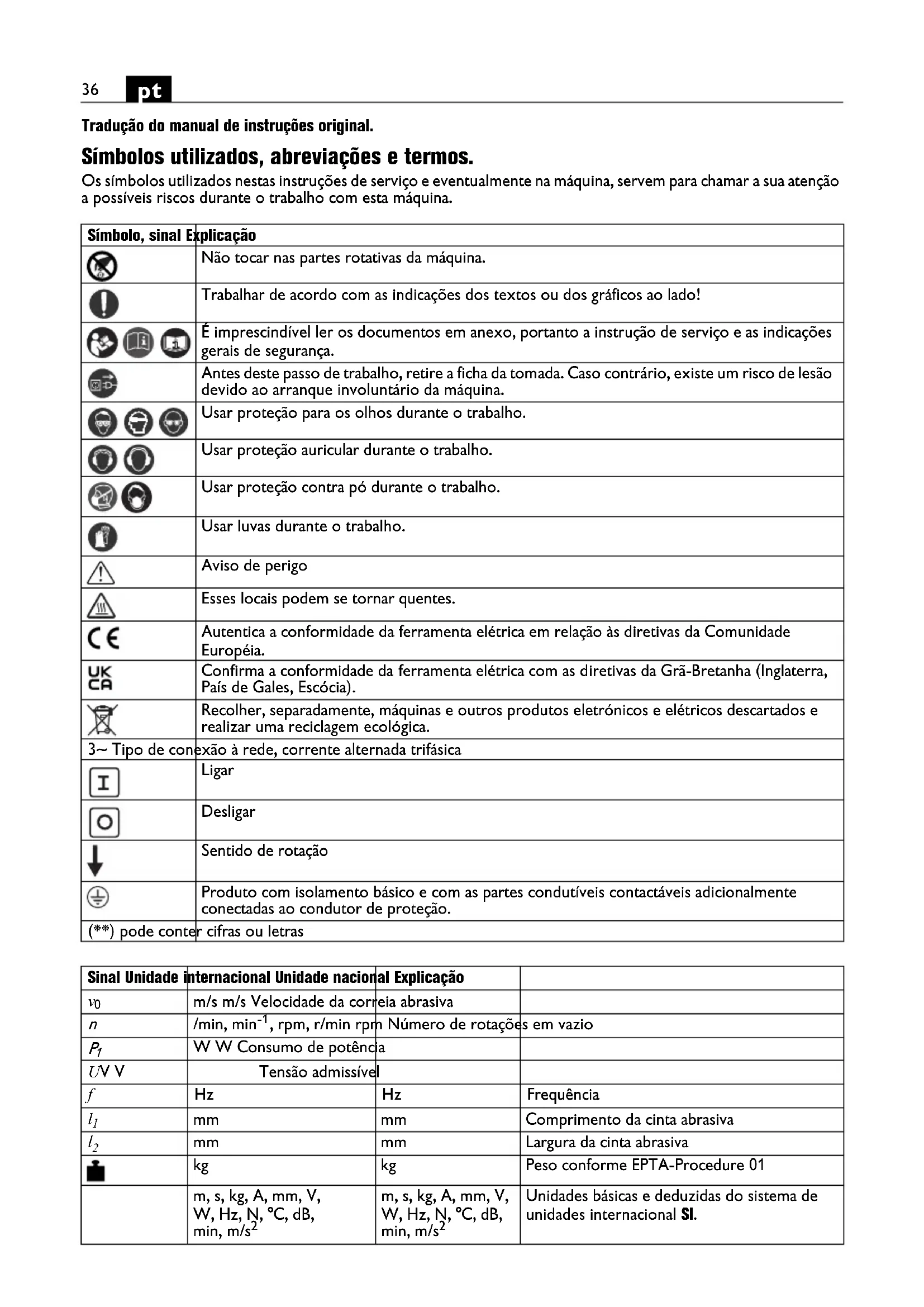 Tradução do manual de instruções original. Símbolos utilizados, abreviações e termos. Os símbolos utilizados nestas instruções de serviço e eventualmente na máquina, servem para chamar a sua atenção a possíveis riscos durante o trabalho com esta máquina. Símbolo, sinal Explicação Não tocar nas partes rotativas da máquina. Trabalhar de acordo com as indicações dos textos ou dos gráficos ao lado! É imprescindível ler os documentos em anexo, portanto a instrução de serviço e as indicações gerais de segurança. Antes deste passo de trabalho, retire a ficha da tomada. Caso contrário, existe um risco de lesão devido ao arranque involuntário da máquina. Usar proteção para os olhos durante o trabalho. Usar proteção auricular durante o trabalho. Usar proteção contra pó durante o trabalho. Usar luvas durante o trabalho. Aviso de perigo Esses locais podem se tornar quentes. Autentica a conformidade da ferramenta elétrica em relação às diretivas da Comunidade Européia. Confirma a conformidade da ferramenta elétrica com as diretivas da Grã-Bretanha (Inglaterra, País de Gales, Escócia). Recolher, separadamente, máquinas e outros produtos eletrónicos e elétricos descartados e realizar uma reciclagem ecológica. 3~ Tipo de conexão à rede, corrente alternada trifásica Ligar Desligar Sentido de rotação Produto com isolamento básico e com as partes condutíveis contactáveis adicionalmente conectadas ao condutor de proteção. (**) pode conter cifras ou letras Sinal Unidade internacional Unidade nacional Explicação
