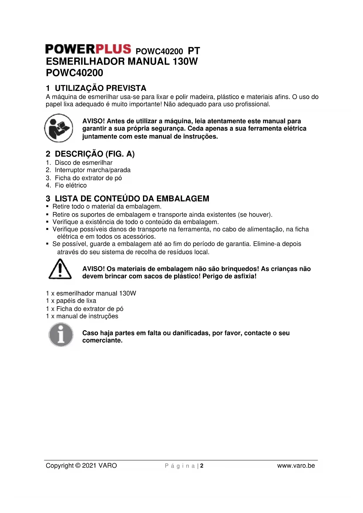 AVISO! Antes de utiliser a boa, leia atentamente este manual para garantir a sua和个人a seguranca. Ceda apenas a sua ferramenta eletrica juntamente com this manual de instruções.