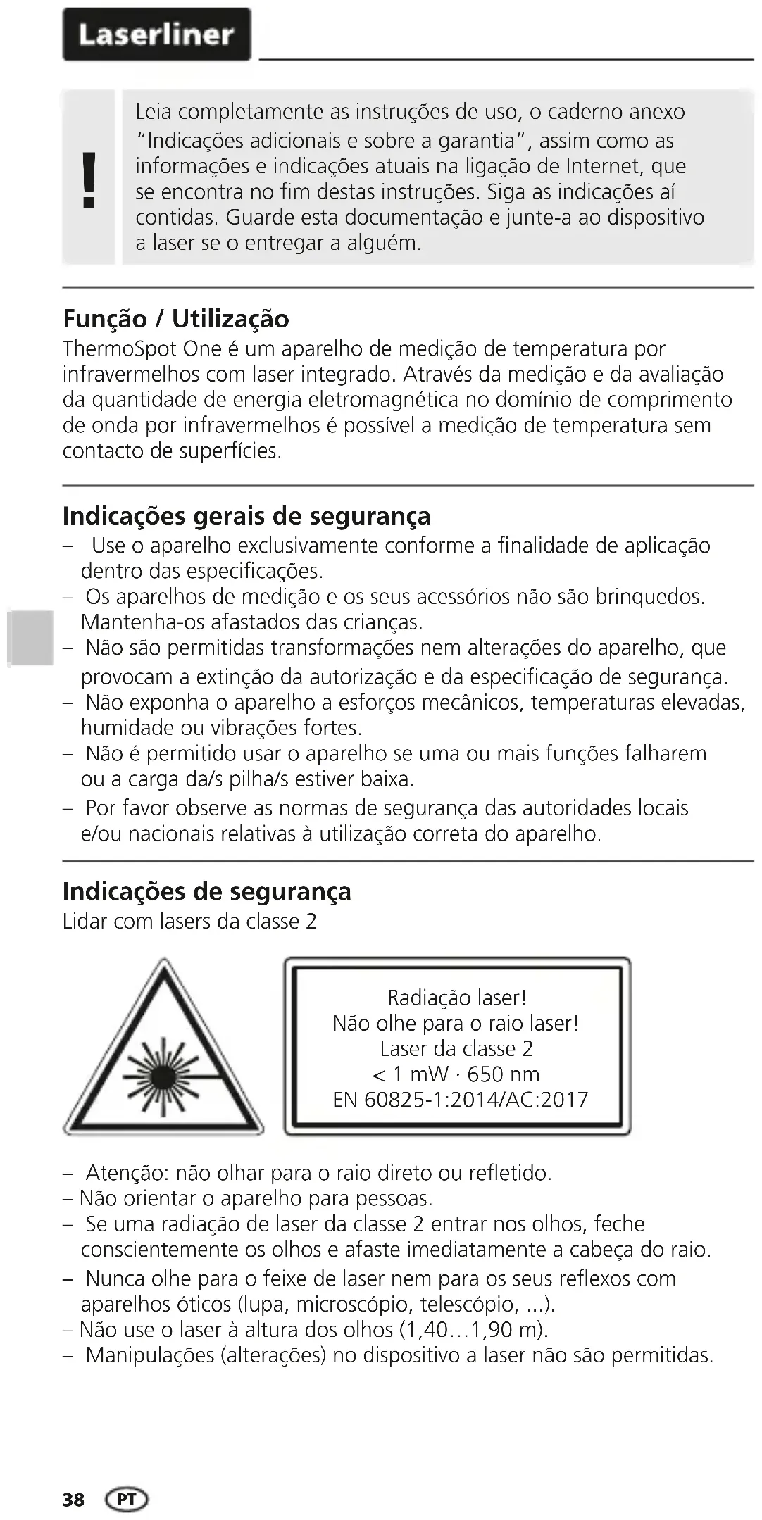 Função / Utilização ThermoSpot One é um aparelho de medição de temperatura por infravermelhos com laser integrado. Através da medição e da avaliação da quantidade de energia eletromagnética no domínio de comprimento de onda por infravermelhos é possível a medição de temperatura sem contacto de superfícies. – Atenção: não olhar para o raio direto ou reetido. – Não orientar o aparelho para pessoas. – Se uma radiação de laser da classe 2 entrar nos olhos, feche conscientemente os olhos e afaste imediatamente a cabeça do raio. – Nunca olhe para o feixe de laser nem para os seus reexos com aparelhos óticos (lupa, microscópio, telescópio, ...). – Não use o laser à altura dos olhos (1,40…1,90 m). – Manipulações (alterações) no dispositivo a laser não são permitidas. Indicações de segurança Lidar com lasers da classe 2 Indicações gerais de segurança – Use o aparelho exclusivamente conforme a nalidade de aplicação dentro das especicações. – Os aparelhos de medição e os seus acessórios não são brinquedos. Mantenha-os afastados das crianças. – Não são permitidas transformações nem alterações do aparelho, que provocam a extinção da autorização e da especicação de segurança. – Não exponha o aparelho a esforços mecânicos, temperaturas elevadas, humidade ou vibrações fortes. – Não é permitido usar o aparelho se uma ou mais funções falharem ou a carga da/s pilha/s estiver baixa. – Por favor observe as normas de segurança das autoridades locais e/ou nacionais relativas à utilização correta do aparelho. Leia completamente as instruções de uso, o caderno anexo “Indicações adicionais e sobre a garantia”, assim como as informações e indicações atuais na ligação de Internet, que se encontra no fim destas instruções. Siga as indicações aí contidas. Guarde esta documentação e junte-a ao dispositivo a laser se o entregar a alguém.