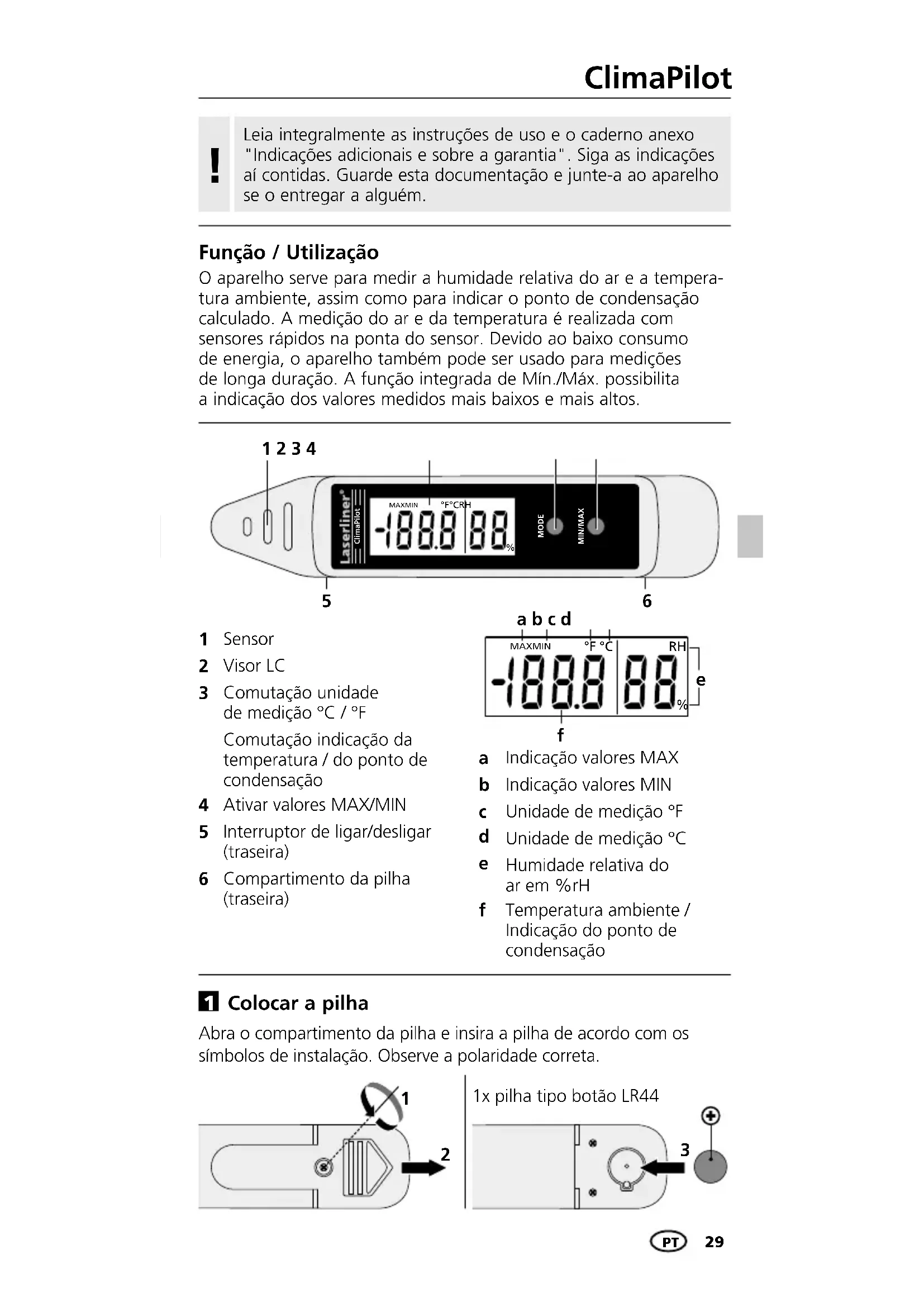ON / OFF Coloque o interruptor (5) em ON para ligar. O aparelho indica a temperatura ambiente e a humidade relativa do ar. °C / °F Para regular a unidade de temperatura pretendida, mantenha a tecla "MODE" carregada durante 2 segundos até o símbolo correspondente aparecer no visor. MAX / MIN Indicação do ponto de condensação Para averiguar os valores máximos ou mínimos medidos durante uma medição, prima a tecla "MAX / MIN" até "MAX" ou "MIN" aparecer no visor. O modo de medição normal está ajustado quando não houver uma função a piscar no visor. Ao premir brevemente a tecla "MODE" é indicado o ponto de condensação medido. Indicações – O produto é um instrumento de precisão que precisa de ser tratado com cuidado. Evite choques e vibrações, assim como a exposição a calor ou frio extremo. – Evite o contacto direto com líquidos. – Use um pano macio ligeiramente húmido para a limpeza.ClimaPilot