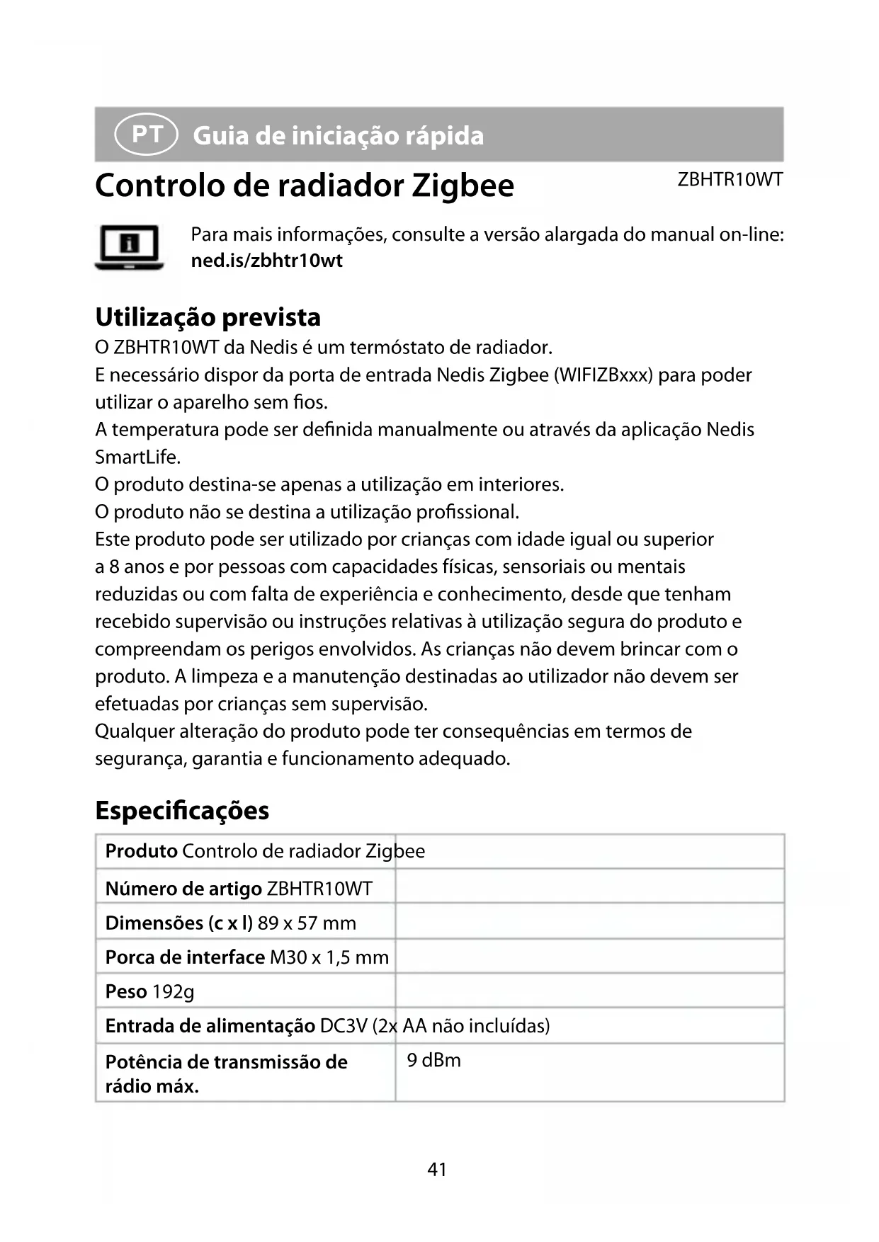 Guia de iniciação rápida Controlo de radiador Zigbee ZBHTR10WT Para mais informações, consulte a versão alargada do manual on-line: ned.is/zbhtr10wt Utilização prevista O ZBHTR10WT da Nedis é um termóstato de radiador. E necessário dispor da porta de entrada Nedis Zigbee (WIFIZBxxx) para poder utilizar o aparelho sem os. A temperatura pode ser denida manualmente ou através da aplicação Nedis SmartLife. O produto destina-se apenas a utilização em interiores. O produto não se destina a utilização prossional. Este produto pode ser utilizado por crianças com idade igual ou superior a 8 anos e por pessoas com capacidades físicas, sensoriais ou mentais reduzidas ou com falta de experiência e conhecimento, desde que tenham recebido supervisão ou instruções relativas à utilização segura do produto e compreendam os perigos envolvidos. As crianças não devem brincar com o produto. A limpeza e a manutenção destinadas ao utilizador não devem ser efetuadas por crianças sem supervisão. Qualquer alteração do produto pode ter consequências em termos de segurança, garantia e funcionamento adequado. Especicações Produto Controlo de radiador Zigbee Número de artigo ZBHTR10WT Dimensões (c x l) 89 x 57 mm Porca de interface M30 x 1,5 mm Peso 192g Entrada de alimentação DC3V (2x AA não incluídas) Potência de transmissão de rádio máx. 9 dBm42 Gama de frequências 2405 - 2480 MHz Alcance sem os ≥30 metros a céu aberto Intervalo de denição de temperatura Modo automático Modo manual Modo anticongelamento 5 °C ~ 30 °C 5 °C ~ 30 °C 5 °C ~ 15 °C Temperatura de medição 0 °C ~ 50 °C Intervalos de medição 2 minutos Curso da válvula Máx. 6 mm Nível de ruído <35 dBa Temperatura ambiente -20 °C ~ 65 °C Temperatura de armazenamento 0 °C ~ 40 °C Temperatura máxima da água 90 °C Normas ambientais RoHS Peças principais (imagem A) 1 Porca de anel 2 Corpo 3 Roda do termóstato 4 Ecrã LCD 5 Falha 6 Bateria fraca 7 Temperatura denida 8 Deteção de janela 9 Modo automático q Bloqueio para crianças w Indicador de rede e Modo de instalação r Modo manual Visão geral da aplicação (imagem B) 1 Estado da bateria 2 Temperatura denida 3 Temperatura ambiente 4 Modo manual 5 Modo automático 6 Bloqueio para crianças 7 Deteção de válvula 8 Mostrador de temperatura 9 Intervalo de temperatura q Modo anticongelamento w Deteção de janela43 Instruções de segurança