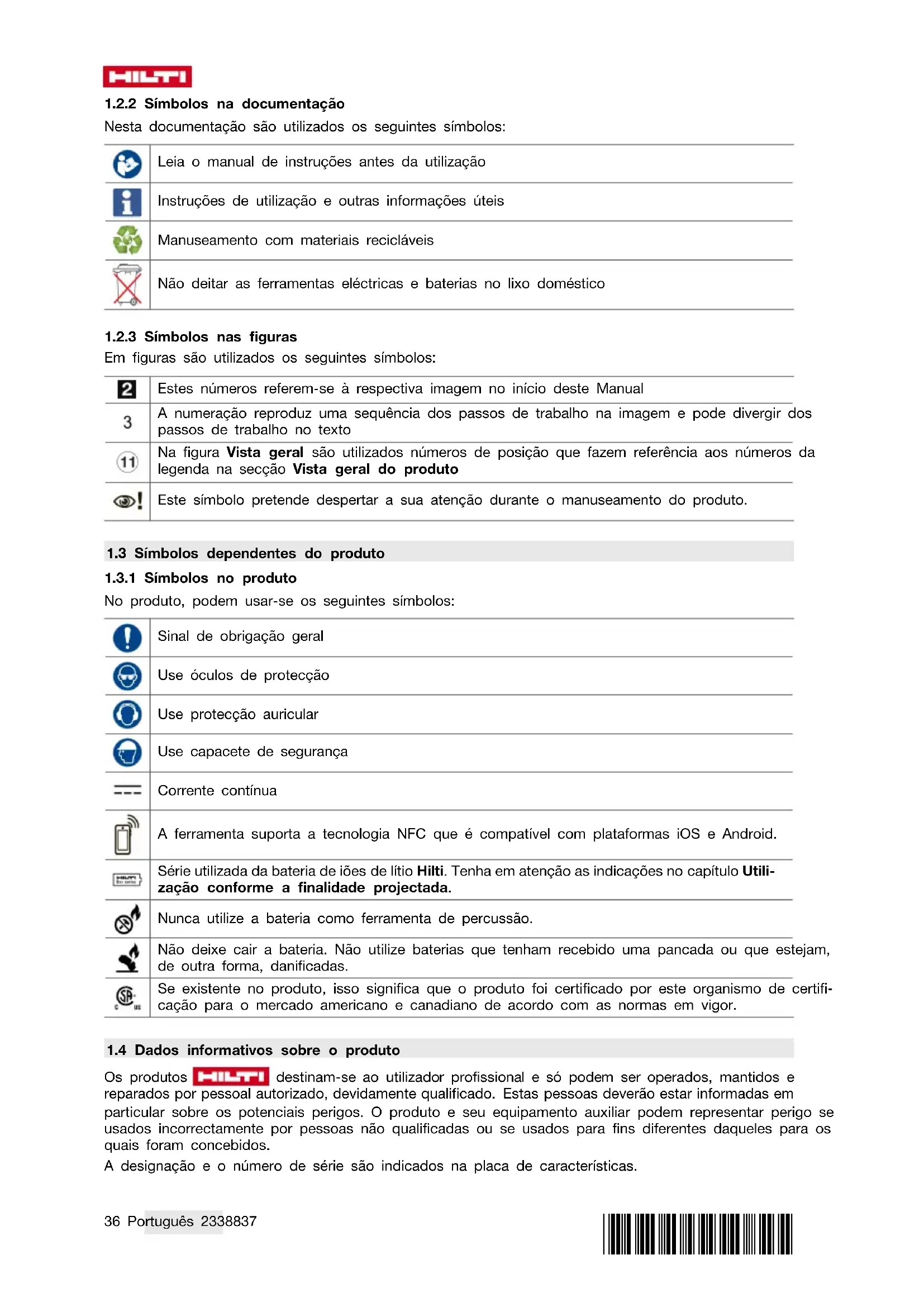 Pressione a ferramenta com uma força menor contra o material de base. Ferramenta pressionada fora do eixo de colocação. ▶ Pressione a ferramenta na perpendicular ou sobre a superfície do punho no lado de trás da ferramenta. 10 Reciclagem AVISO Perigo de ferimentos devido a eliminação incorrecta! Riscos para a saúde devido à fuga de gases ou líquidos. ▶ Não envie quaisquer baterias danificadas! ▶ Para evitar curto-circuitos, cubra as conexões com um material não condutor. ▶ Elimine as baterias de modo a mantê-las longe do alcance das crianças. ▶ Efectue a reciclagem da bateria na sua Hilti Store ou entre em contacto com a empresa de recolha de lixo responsável. Os produtos Hilti são, em grande parte, fabricados com materiais recicláveis. Um pré-requisito para a reciclagem é que esses materiais sejam devidamente separados. Em muitos países, a Hilti aceita o seu aparelho usado para reaproveitamento. Para mais informações, dirija-se ao Serviço de Clientes Hilti ou ao seu vendedor. ▶ Não deite as ferramentas eléctricas, aparelhos electrónicos e baterias no lixo doméstico! 11 Garantia do fabricante ▶ Se tiver dúvidas em relação às condições de garantia, contacte o seu parceiro Hilti local. 12 Mais informações Pode consultar informações mais pormenorizadas sobre Utilização, Tecnologia, Meio ambiente e Reciclagem na seguinte hiperligação: qr.hilti.com/manual/?id=2338837 Também pode encontrar esta hiperligação no final da documentação sob a forma de código QR. 13 Declaração FCC (válida nos EUA) / Declaração IC (válida no Canadá) Este produto está de acordo com a Parte 15 das especificações FCC e RSS210 do IC. A utilização está sujeita às duas seguintes condições: