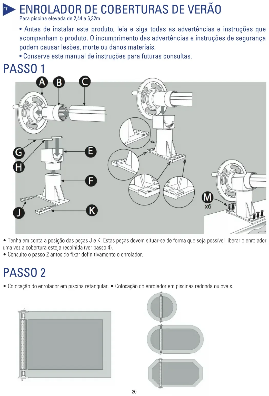 - Colocação do enrolador em piscina retangular. • Colocação do enrolador em piscinas redonda ou ovais.21 PASSO 3