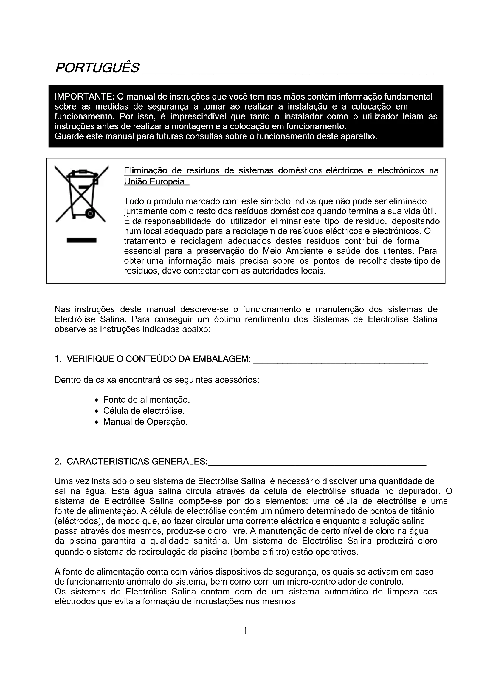 Nas instruções deste manual descreve-se o funcionamento e manutenção dos sistemas de Electrólise Salina. Para conseguir um óptimo rendimento dos Sistemas de Electrólise Salina observe as instruções indicadas abaixo: