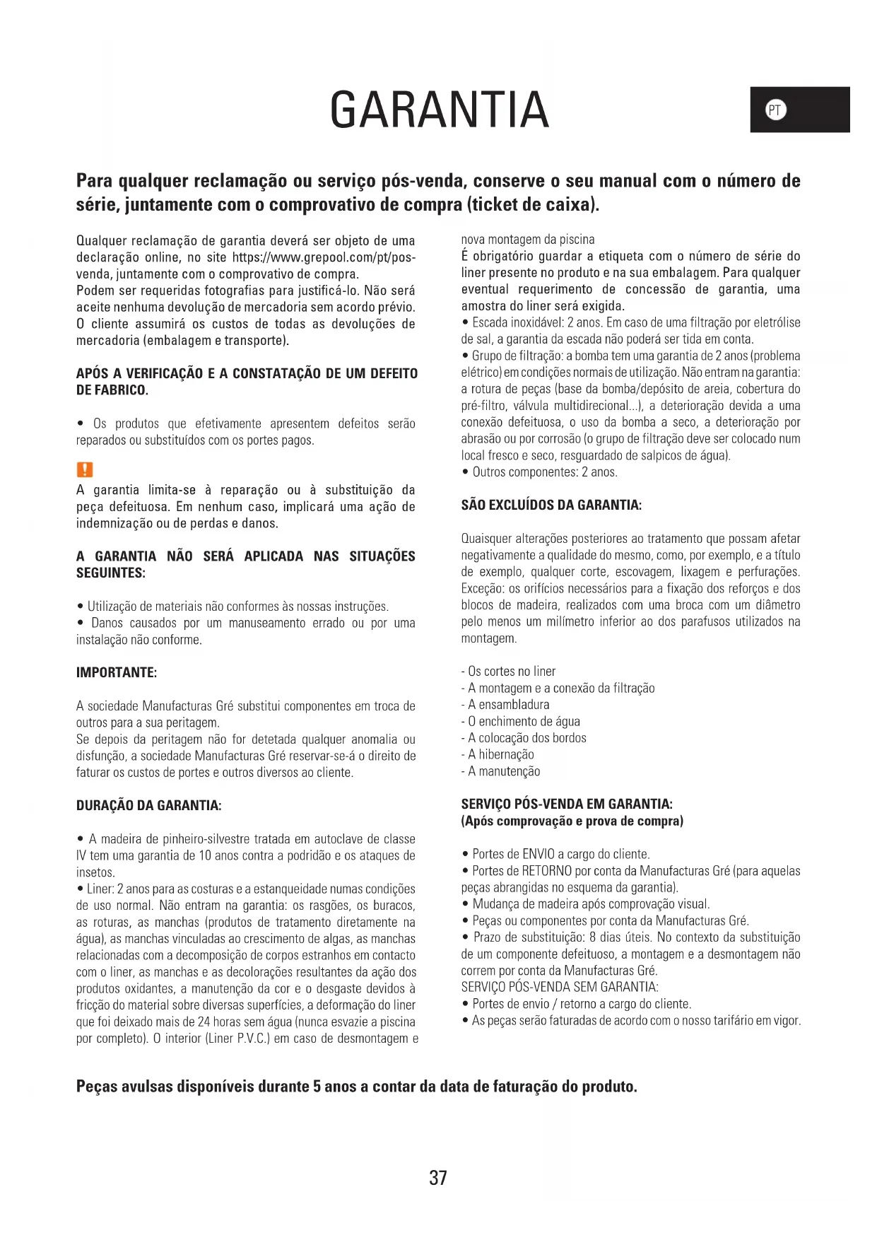 GARANTIA Para qualquer reclamação ou serviço pós-venda, conserve o seu manual com o número de série, juntamente com o comprovativo de compra (ticket de caixa). Peças avulsas disponíveis durante 5 anos a contar da data de faturação do produto. Qualquer reclamação de garantia deverá ser objeto de uma declaração online, no site https://www.grepool.com/pt/pos- venda, juntamente com o comprovativo de compra. Podem ser requeridas fotografias para justificá-lo. Não será aceite nenhuma devolução de mercadoria sem acordo prévio. O cliente assumirá os custos de todas as devoluções de mercadoria (embalagem e transporte). APÓS A VERIFICAÇÃO E A CONSTATAÇÃO DE UM DEFEITO DE FABRICO.