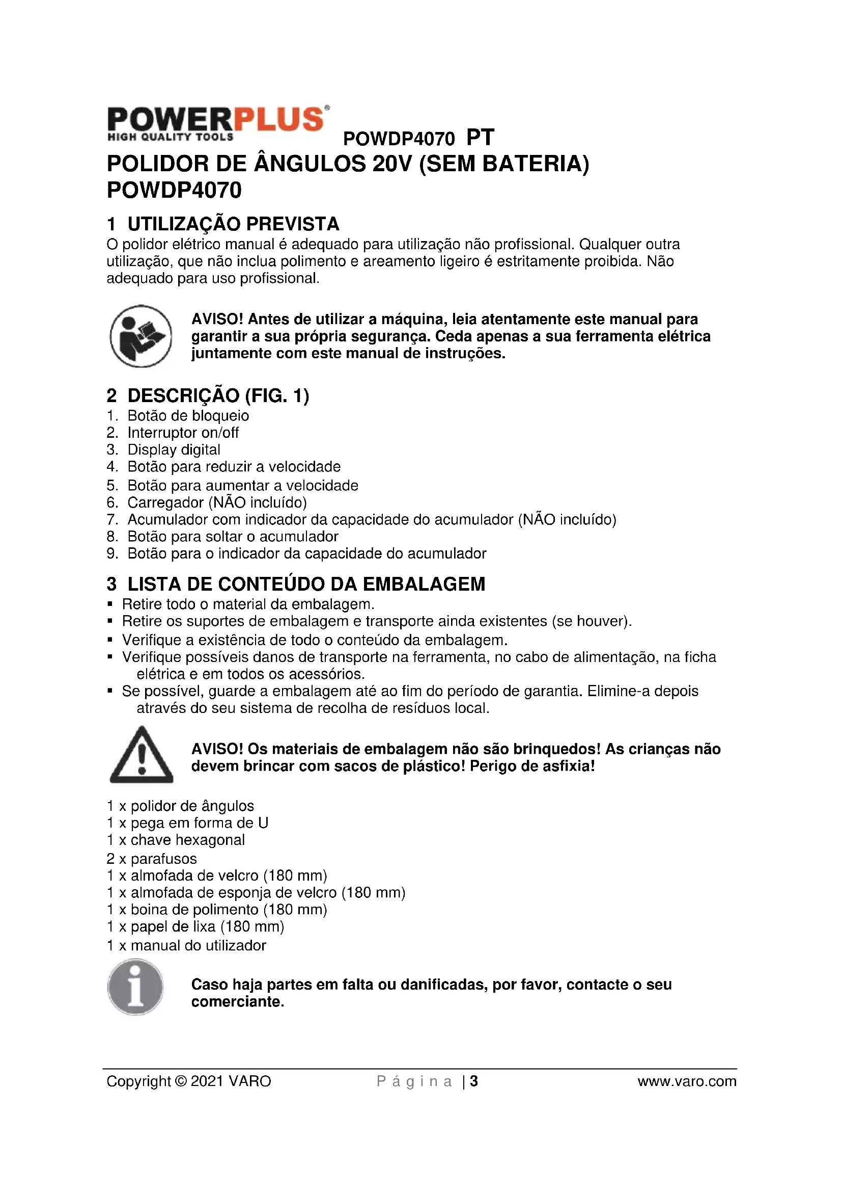 - Se possível, guarde a embalagem até ao fim do período de garantia. Elimine-a depois através do seu sistema de recolha de resíduos local. AVISO! Os materiais de embalagem não são brinquedos! As crianças não devem brincar com sacos de plástico! Perigo de asfixia! 1 x polidor de ângulos 1 x pega em forma de U 1 x chave hexagonal 2 x parafusos 1 x almofada de velcro (180 mm) 1 x almofada de esponja de velcro (180 mm) 1 x boina de polimento (180 mm) 1 x papel de lixa (180 mm) 1 x manual do utilizador Caso haja partes em falta ou danificadas, por favor, contacte o seu comerciante.POWDP4070 PT Copyright © 2021 VARO P á g i n a | 4 www.varo.com 4 SÍMBOLOS Neste manual e/ou na máquina são utilizados os seguintes símbolos: