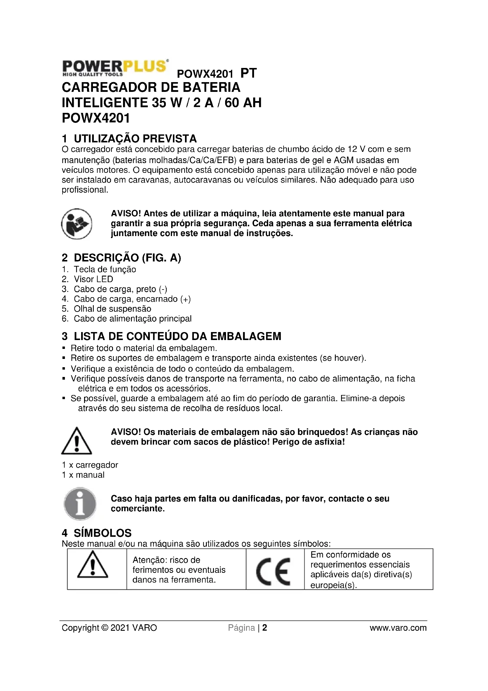 Tipo POWX4201 Tensão principal 220-240 V ~50 Hz Potência nominal máx. 35 W Tensão de saída nominal 12 V DC Corrente de saída nominal máx. 2 A Temperatura ambiente -20 °C – 40 °C Capacidade da bateria 3-60 Ah “Modo de manutenção” da capacidade da bateria (máx. 1A) 3-32 Ah 9 MEIO-AMBIENTE Se a sua máquina necessitar de ser substituída após uma utilização prolongada, não a coloque no lixo doméstico. Elimine-a de uma forma ecologicamente segura. O lixo produzido pelas máquinas elétricas não pode ser eliminado com o lixo doméstico normal. Faça a reciclagem onde existam instalações adequadas. Consulte as autoridades locais ou o seu revendedor para conselhos sobre a recolha e a eliminação.POWX4201 PT Copyright © 2021 VARO Página | 8 www.varo.com