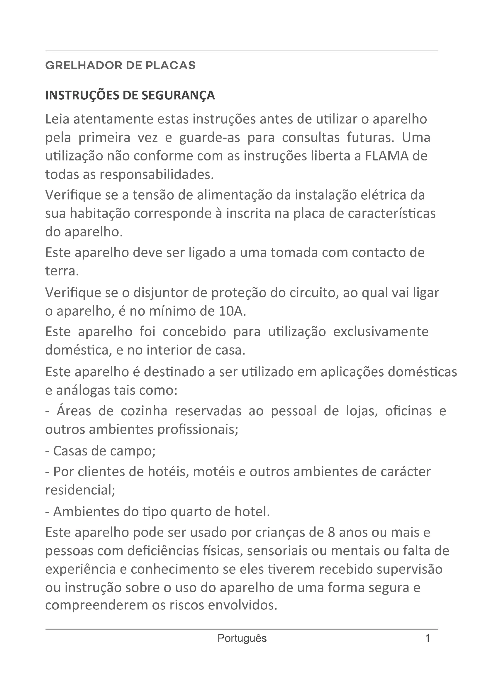 Leia atentamente estas instruções antes de ulizar o aparelho pela primeira vez e guarde-as para consultas futuras. Uma ulização não conforme com as instruções liberta a FLAMA de todas as responsabilidades. Verique se a tensão de alimentação da instalação elétrica da sua habitação corresponde à inscrita na placa de caracteríscas do aparelho. Este aparelho deve ser ligado a uma tomada com contacto de terra. Verique se o disjuntor de proteção do circuito, ao qual vai ligar o aparelho, é no mínimo de 10A. Este aparelho foi concebido para ulização exclusivamente domésca, e no interior de casa. Este aparelho é desnado a ser ulizado em aplicações doméscas e análogas tais como: - Áreas de cozinha reservadas ao pessoal de lojas, ocinas e outros ambientes prossionais; - Casas de campo; - Por clientes de hotéis, motéis e outros ambientes de carácter residencial; - Ambientes do po quarto de hotel. Este aparelho pode ser usado por crianças de 8 anos ou mais e pessoas com deciências sicas, sensoriais ou mentais ou falta de experiência e conhecimento se eles verem recebido supervisão ou instrução sobre o uso do aparelho de uma forma segura e compreenderem os riscos envolvidos. GRELHADOR DE PLACAS2 www.ama.pt As crianças devem ser supervisionadas para garanr que não brincam com o aparelho. O aparelho não é desnado a ser posto em funcionamento por meio de um temporizador externo ou por um sistema separado de comando à distância. Antes de ligar o aparelho, cerque-se que o coloca numa supercie plana, estável e horizontal. A limpeza e manutenção do aparelho não devem ser feitas por crianças a não ser que tenham mais de 8 anos e sejam supervisionadas. Mantenha o aparelho e o seu cabo de alimentação fora do alcance de crianças com menos de 8 anos, quando este está ligado ou em arrefecimento. Aviso - As temperaturas das supercies acessíveis podem ser elevadas durante o funcionamento do aparelho. Desligue o aparelho da alimentação removendo a cha da tomada xa da alimentação após cada ulização e aquando da limpeza. Deixe-o arrefecer antes de proceder a qualquer operação de limpeza ou de arrumação. Não ulize o aparelho se este não esver a funcionar corretamente ou se esver de algum modo danicado. Qualquer intervenção para além da limpeza deve ser executada num Serviço de Assistência Técnica Autorizado FLAMA. Se o cabo de alimentação se danicar, deve ser substuído pelo fabricante, pelo seu serviço pós-venda ou pessoal de qualicação similar de forma a evitar um perigo. O aparelho nunca deve ser ulizado perto de materiais inamáveis ou combusveis. Nunca deixe o aparelho sem vigilância.3 Português Não tape o aparelho durante o seu funcionamento. Não desmonte o aparelho. O aparelho só deve ser ulizado para cozinhar alimentos. A sua ulização para outros ns poderá provocar danos irreparáveis. Nunca mergulhe o aparelho em água ou qualquer outro líquido. AVISO: Carvão ou outros combusveis não devem ser ulizados com este aparelho. Este produto cumpre as Direvas de Compabilidade Eletromagnéca e de Baixa Tensão. Este manual de instruções também está disponível no formato PDF em www.ama.pt.4 www.ama.pt DESCRIÇÃO