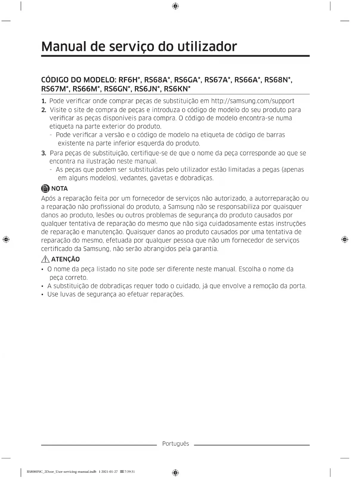 encontra na ilustração neste manual. - As peças que podem ser substituídas pelo utilizador estão limitadas a pegas (apenas em alguns modelos), vedantes, gavetas e dobradiças. NOTA Após a reparação feita por um fornecedor de serviços não autorizado, a autorreparação ou a reparação não prossional do produto, a Samsung não se responsabiliza por quaisquer danos ao produto, lesões ou outros problemas de segurança do produto causados por qualquer tentativa de reparação do mesmo que não siga cuidadosamente estas instruções de reparação e manutenção. Quaisquer danos ao produto causados por uma tentativa de reparação do mesmo, efetuada por qualquer pessoa que não um fornecedor de serviços certicado da Samsung, não serão abrangidos pela garantia. ATENÇÃO
