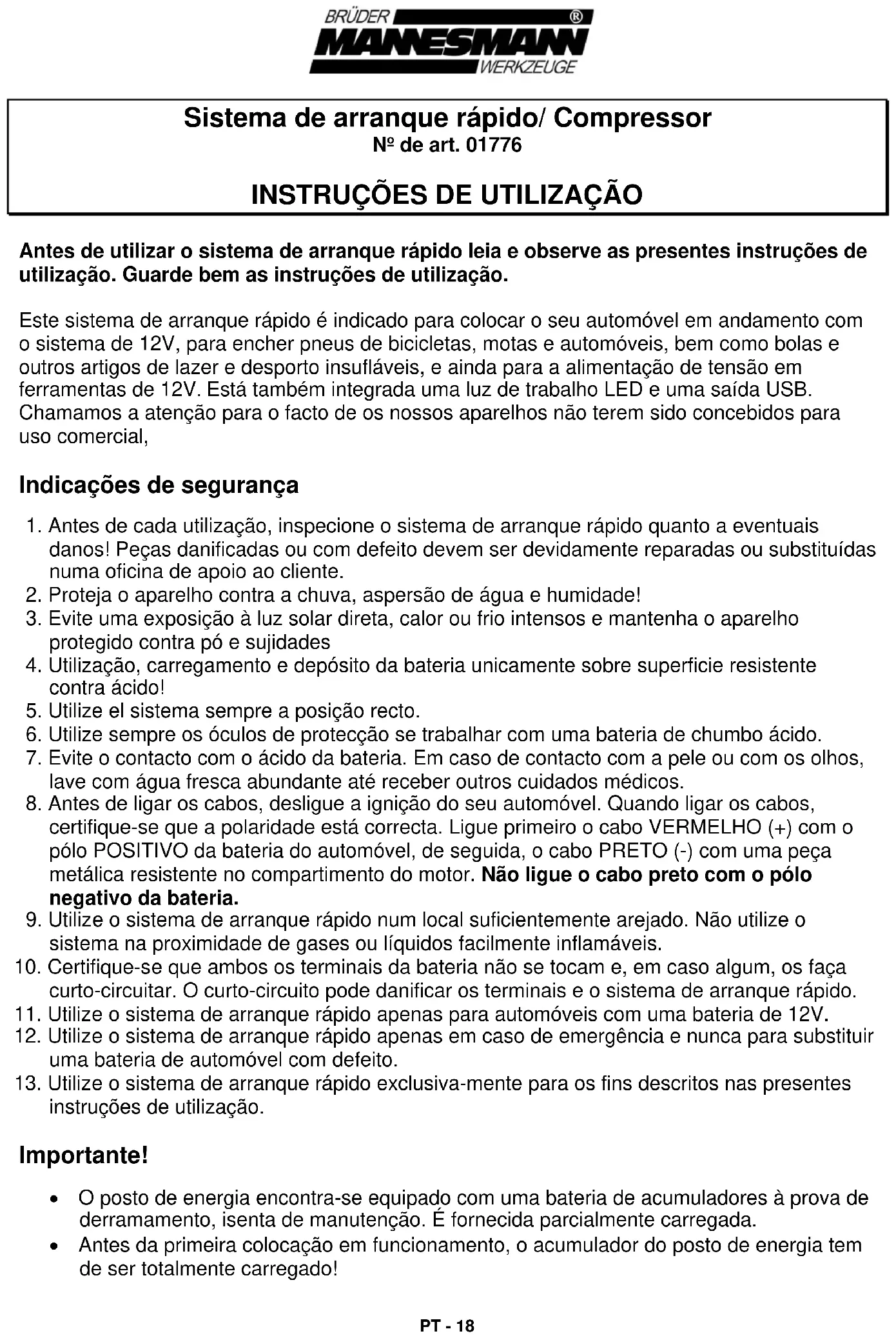 Equipamento: - Compressor até18 bar - Adaptador para encher bolas e brinquedos - Lâmpada de trabalho LED Funcionamento Atenção: um choque eléctrico pode causar ferimentos graves e a morte. Evite o contacto com as peças metálicas dos terminais da bateria, bem como com os pólos da bateria. O sistema de arranque rápido apenas pode ser utilizado como uma ajuda de arranque para automóveis com uma bateria de 12V. Ajuda para arranque