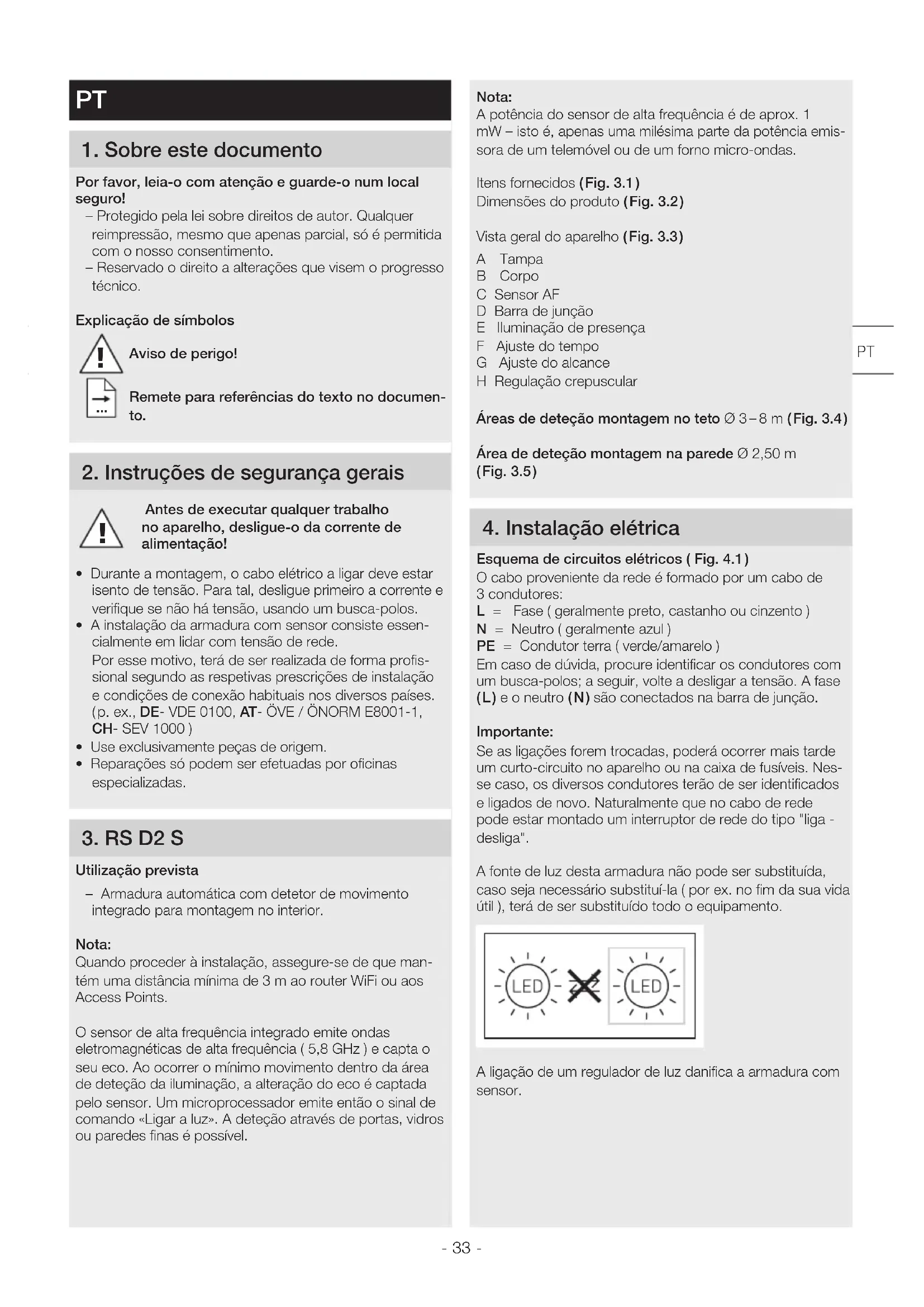 Aviso de perigo! Remete para referências do texto no documen-to 2 Instruções de segurança gerais Antes de executar qualquer trabalho no aparelho, desligue-o da corrente de alimentação! • Durante a montagem, o cabo elétrico a ligar deve estar isento de tensão. Para tal, desligue primeiro a corrente e verifique se não há tensão, usando um busca-polos. • A instalação da armadura com sensor consiste essen-cialmente em lidar com tensão de rede. Por esse motivo, terá de ser realizada de forma profis-sional segundo as respetivas prescrições de instalação e condições de conexão habituais nos diversos países. ( p.ex., DE- VDE 0100, AT- ÖVE / ÖNORM E8001-1, CH- SEV 1000 )• Use exclusivamente peças de origem.• Reparações só podem ser efetuadas por oficinas especializadas. 3 RS D2 S Utilização prevista – Armadura automática com detetor de movimento integrado para montagem no interior.Nota:Quando proceder à instalação, assegure-se de que man-tém uma distância mínima de 3m ao router WiFi ou aos Access Points.O sensor de alta frequência integrado emite ondas eletromagnéticas de alta frequência ( 5,8 GHz ) e capta o seu eco. Ao ocorrer o mínimo movimento dentro da área de deteção da iluminação, a alteração do eco é captada pelo sensor. Um microprocessador emite então o sinal de comando «Ligar a luz». A deteção através de portas, vidros ou paredes finas é possível.