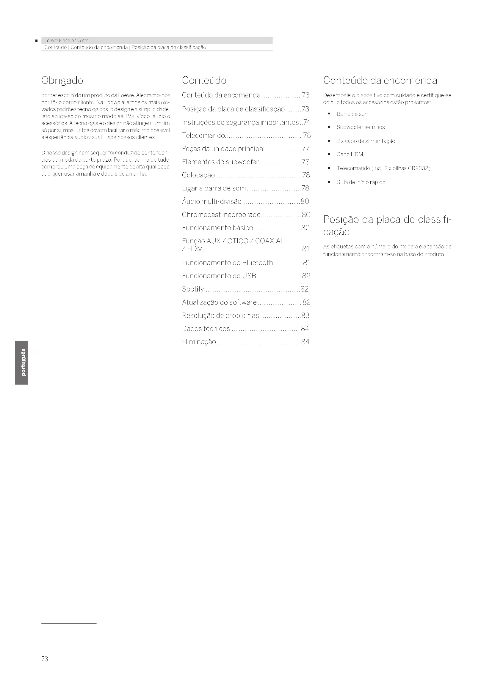 - Loewe klang bar5 mr allemand português Conteúdo | Conteúdo da encomenda | Posição da placa de classicação Obrigado por ter escolhido um produto da Loewe. Alegramo-nos por tê-lo como cliente. Na Loewe aliamos os mais ele- vados padrões tecnológicos, o design e a simplicidade. Isto aplica-se do mesmo modo às TVs, vídeo, áudio e acessórios. A tecnologia e o design não atingem um fim só por si, mas juntos devem facilitar o máximo possível a experiência audiovisual aos nossos clientes. O nosso design nem sequer foi conduzido por tendên- cias da moda de curto prazo. Porque, acima de tudo, comprou uma peça de equipamento de alta qualidade que quer usar amanhã e depois de amanhã. Conteúdo Conteúdo da encomenda p. 73